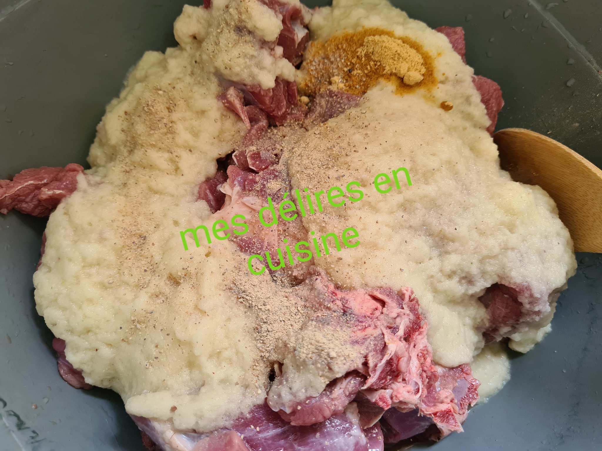 - Mélangez les morceaux de mouton avec le ras el hanout, l’ail et l’oignon mixés, le gingembre, du sel et du poivre.