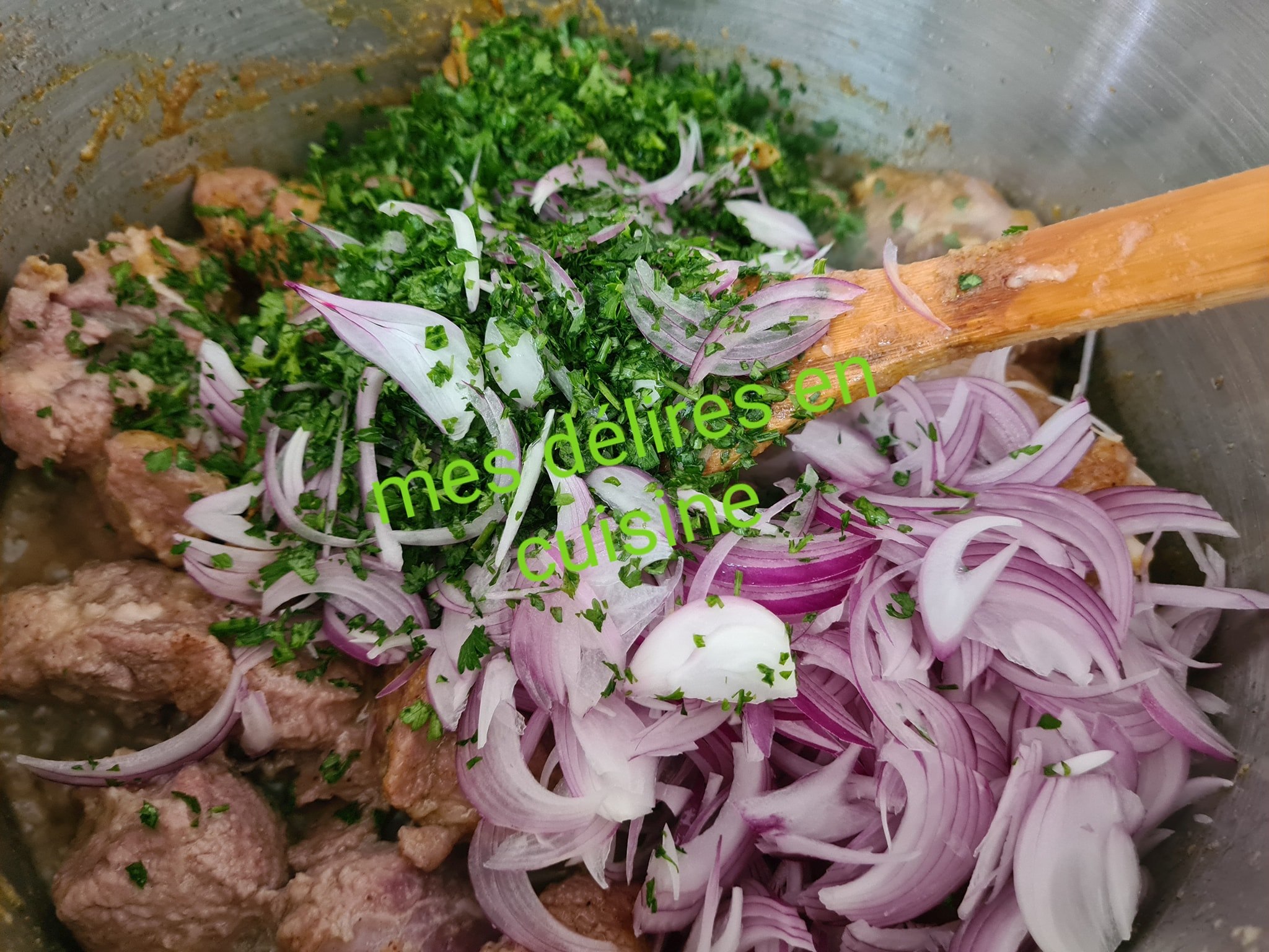 - Incorporez le persil haché et les oignons émincés, laissez mijoter 10 minutes supplémentaires.