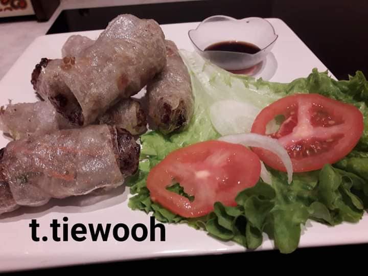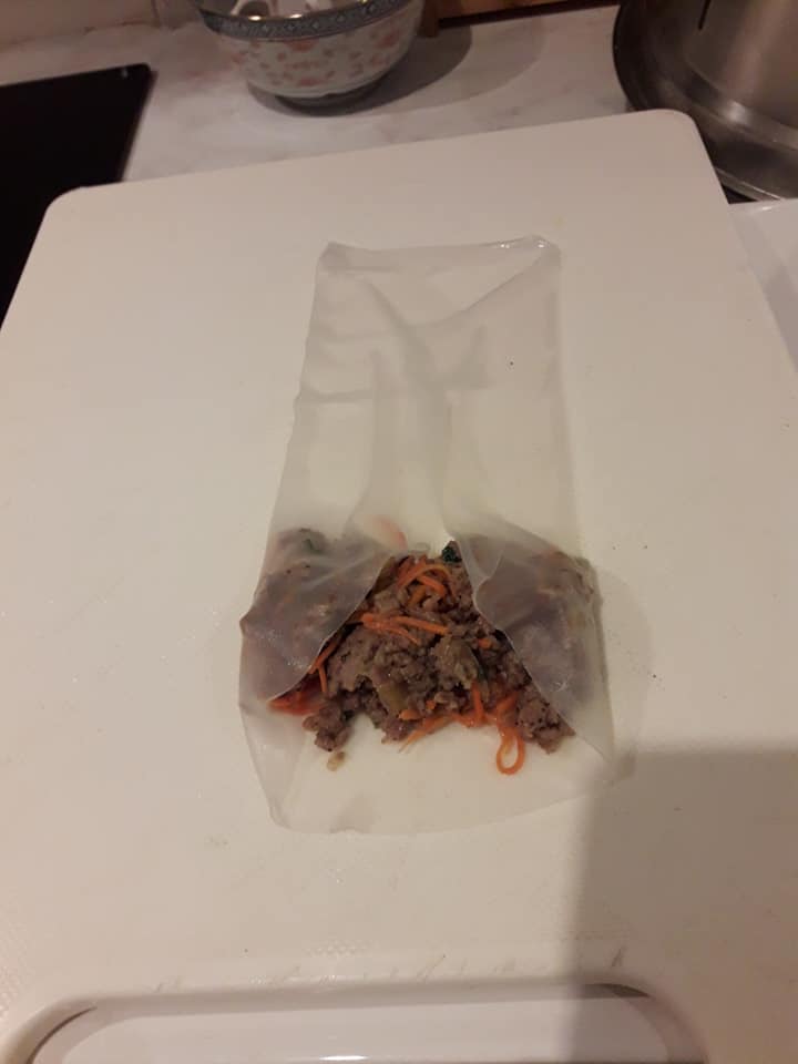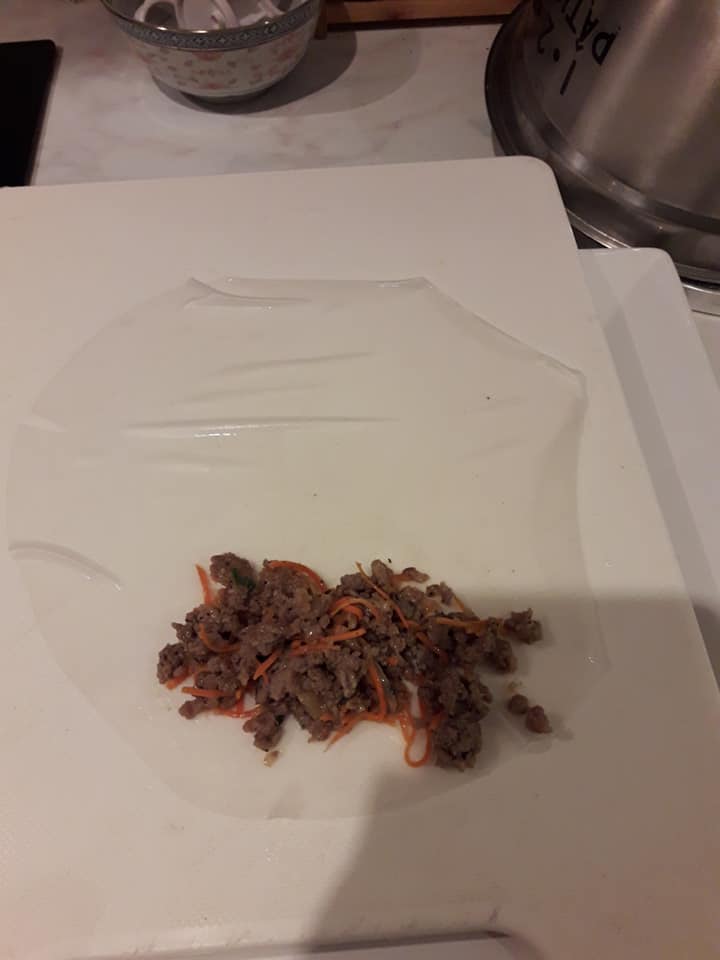 - Trempez rapidement chaque feuille de riz dans de l’eau tiède pour la ramollir.