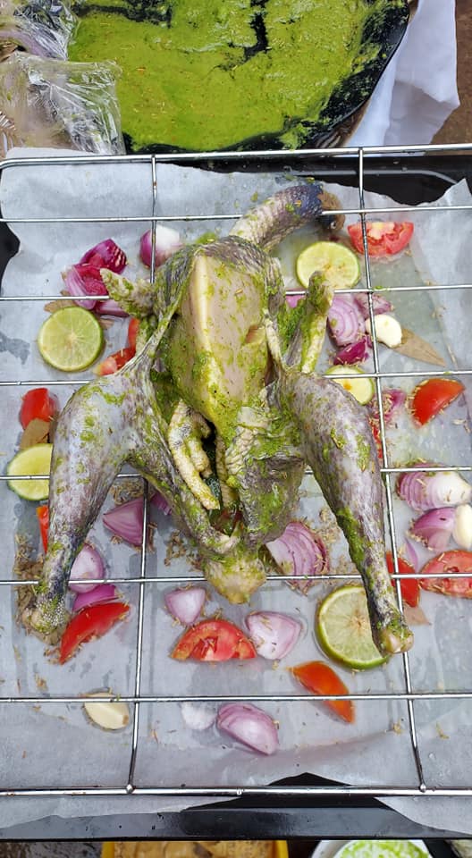 - Enduisez généreusement la pintade avec cette marinade parfumée, en insistant bien sous la peau.