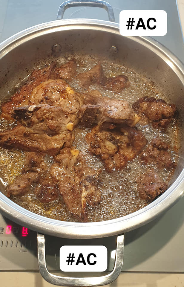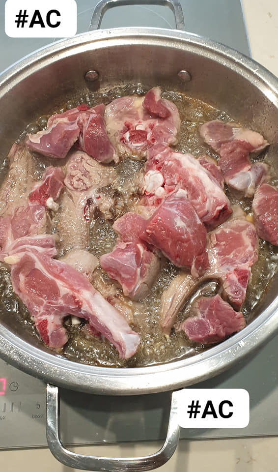 - Ajoutez les morceaux d’agneau, le poivre noir moulu, le poivre blanc moulu, le poivre concassé, un peu de sel et une pincée de gingembre moulu.