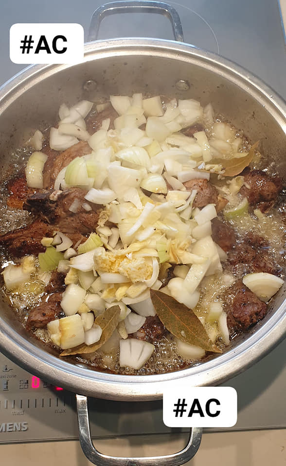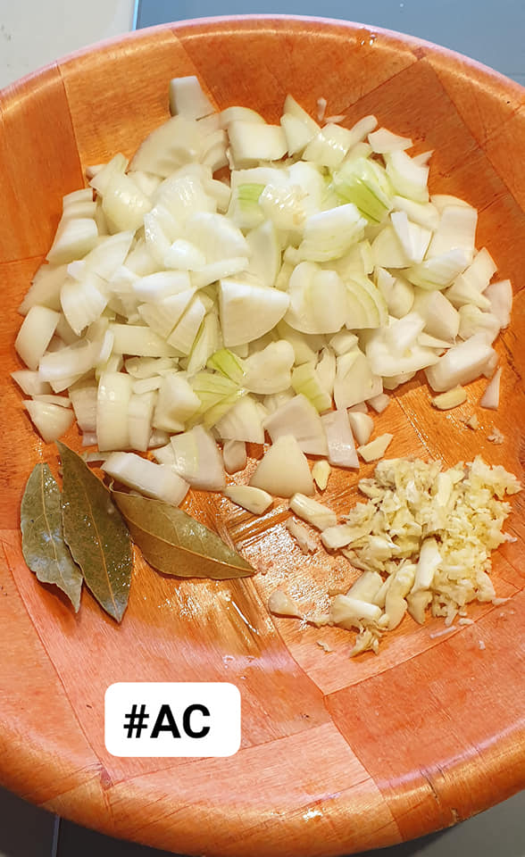 - Ajoutez les oignons coupés, l’ail râpé et les feuilles de laurier.