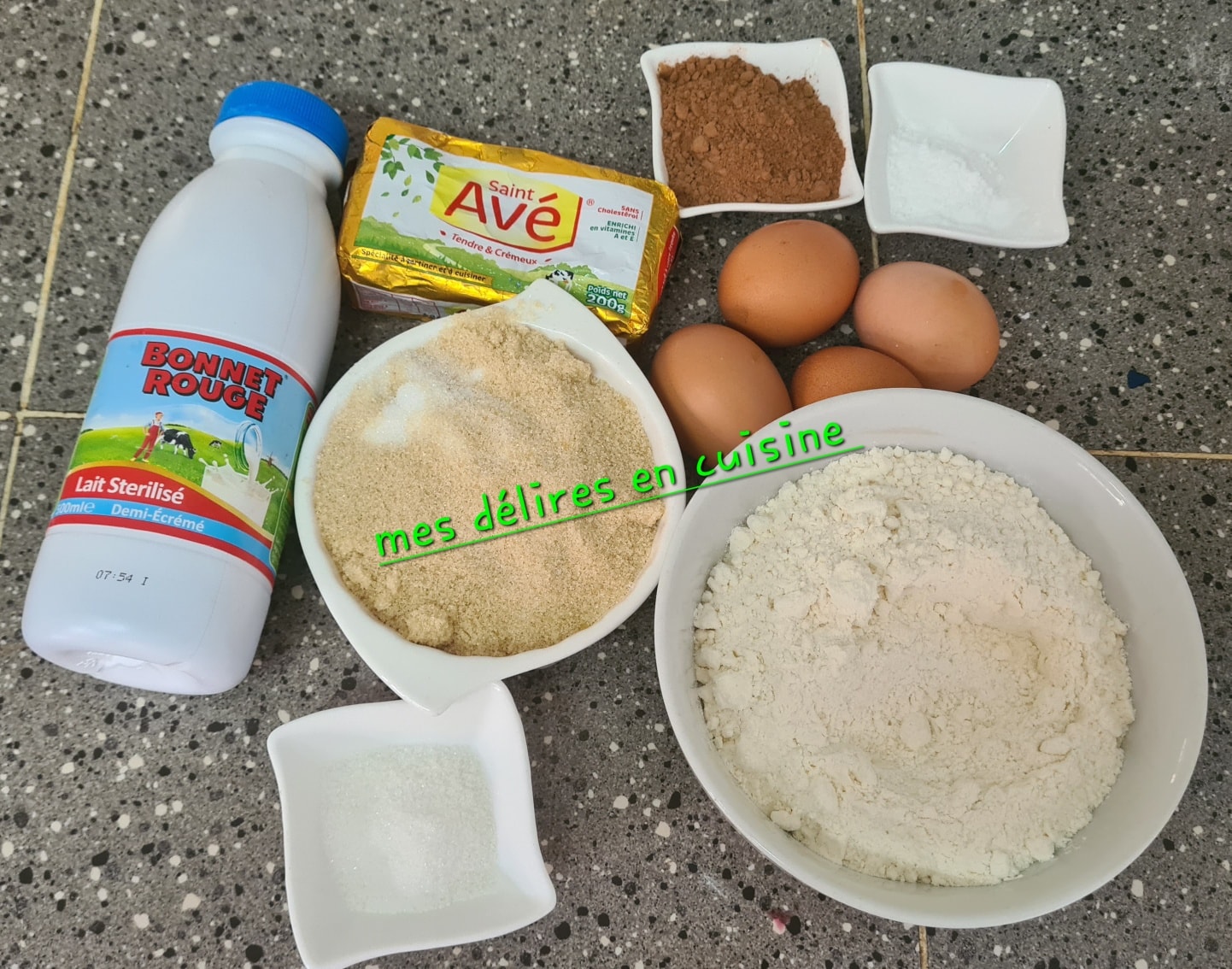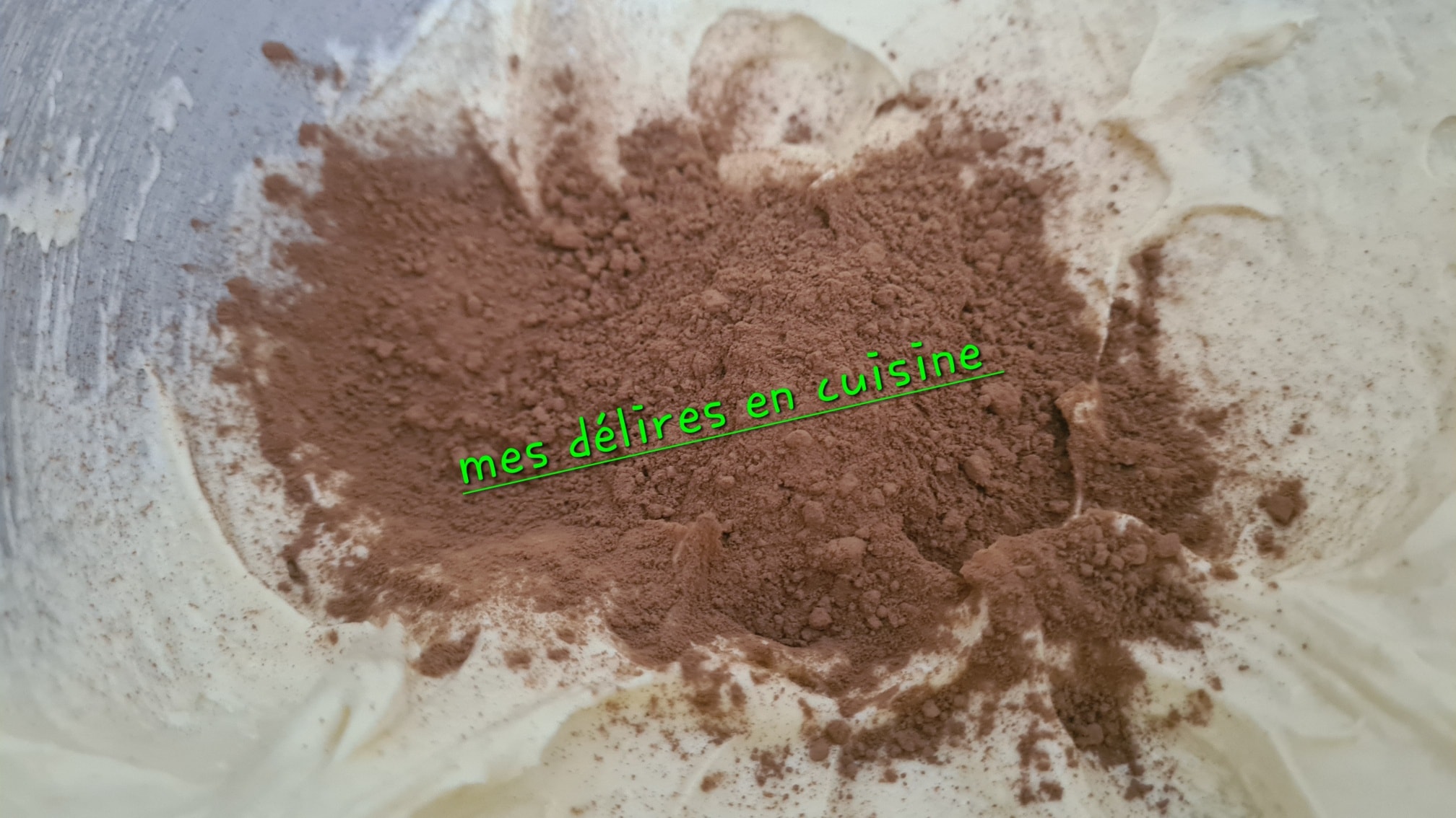 - Dans le second bol : ajoutez la poudre de cacao, 125 g de farine et l’autre moitié de la levure.