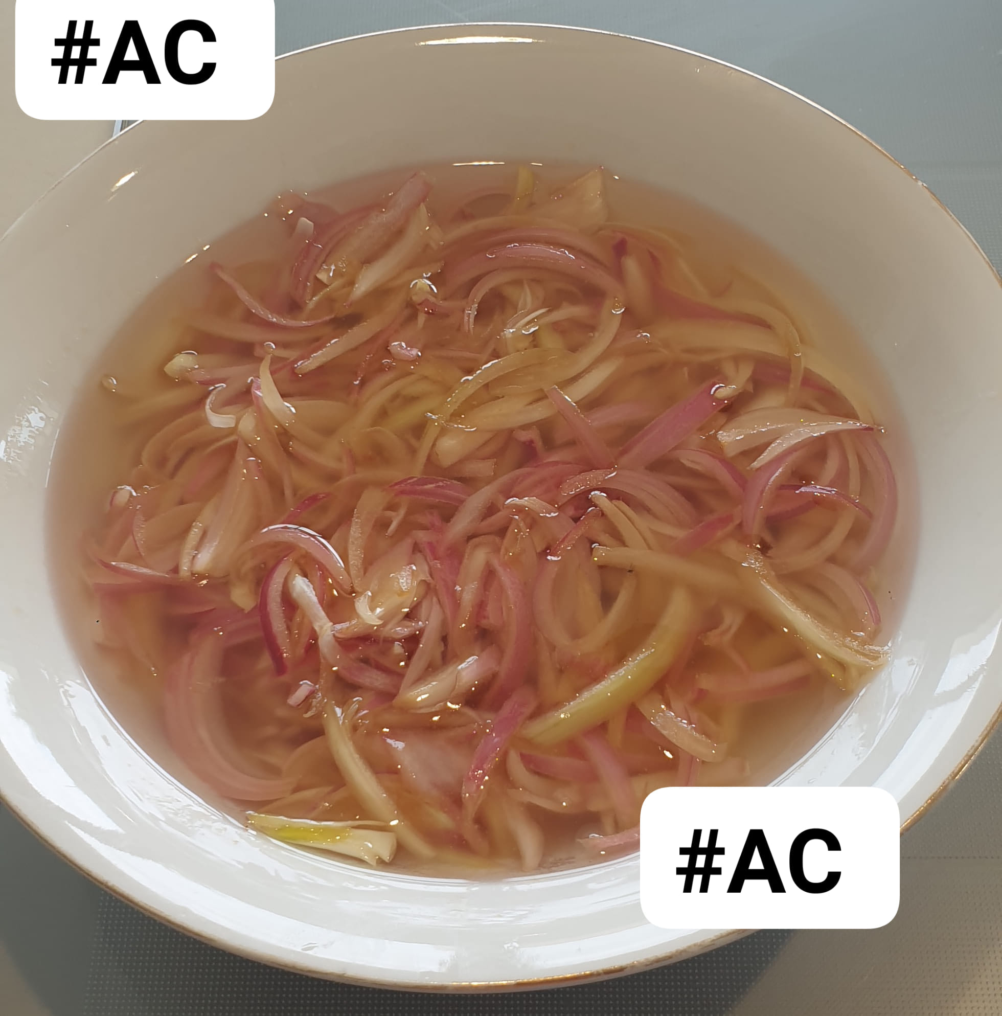 - Émincez des oignons blancs et rouges, puis assaisonnez-les avec quelques gouttes de vinaigre blanc ou de jus de citron, du sel et un cube d’assaisonnement (facultatif).