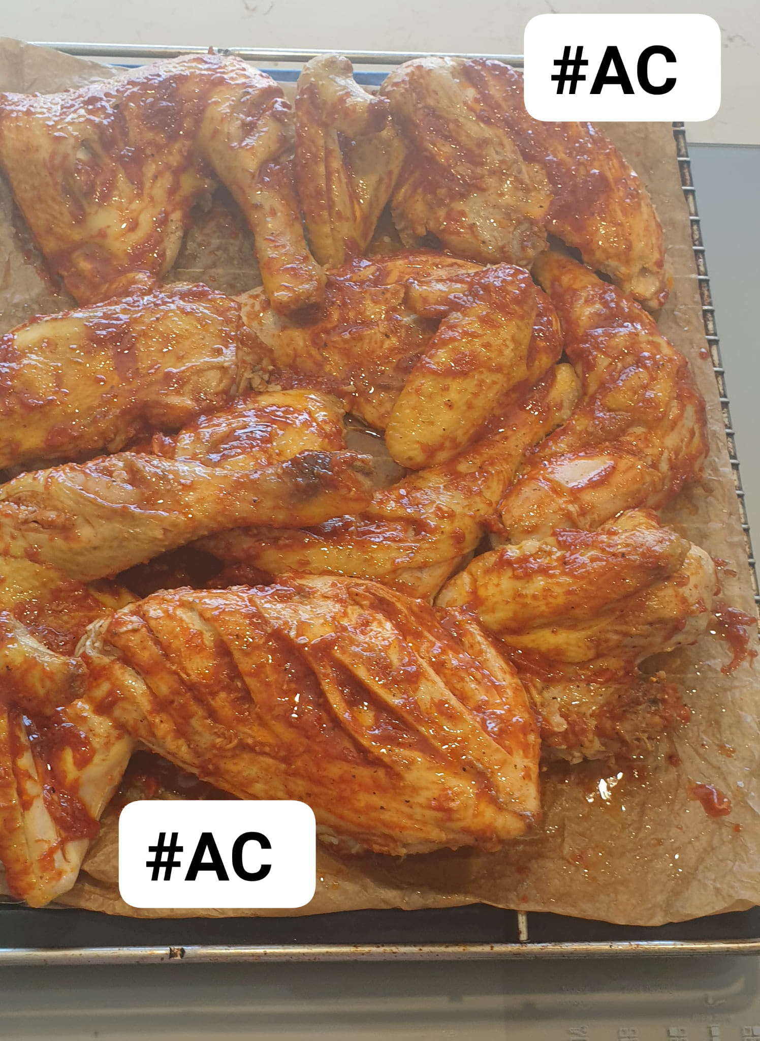 - Badigeonnez généreusement le poulet précuit avec la sauce d’enrobage.