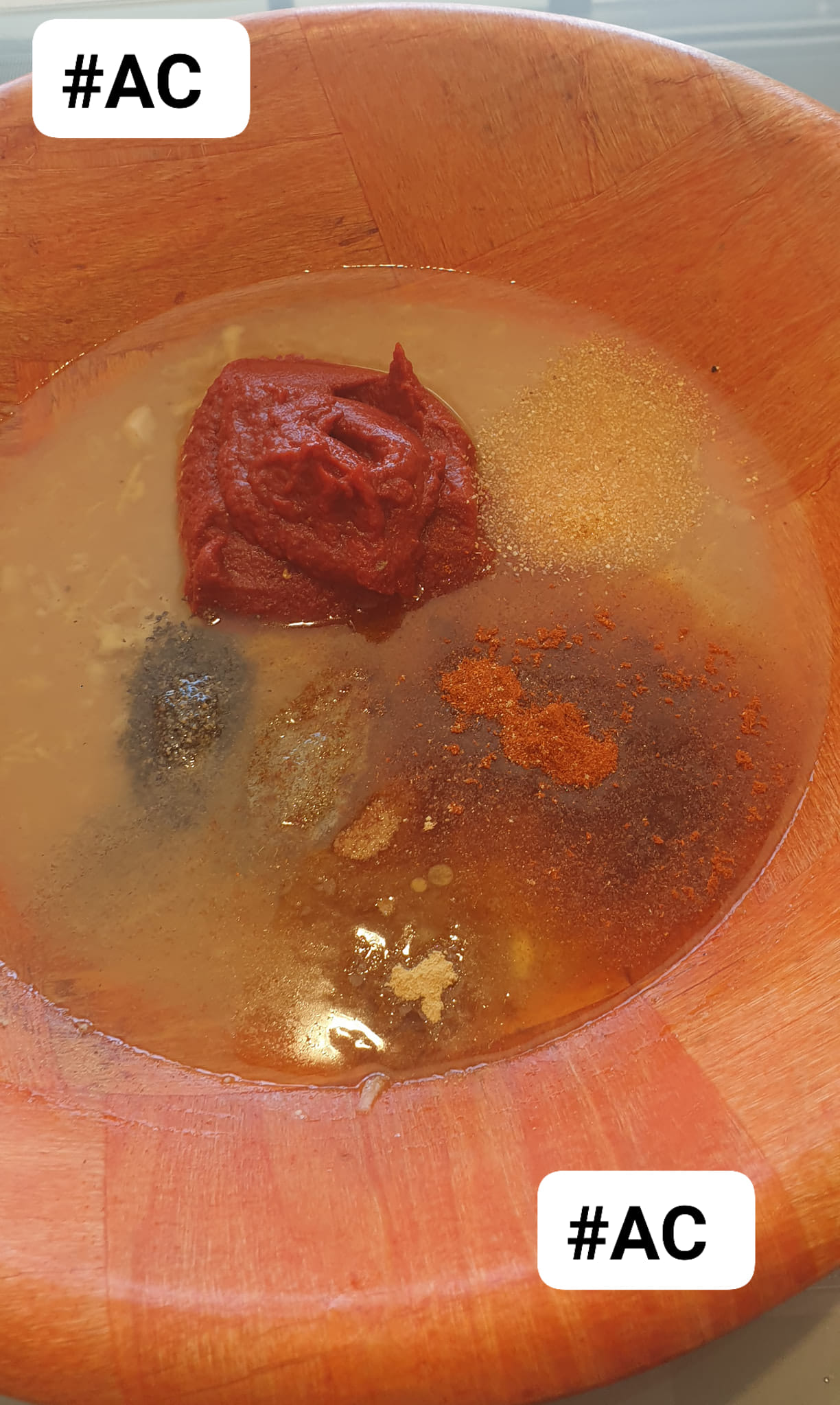 - Dans un bol, mélangez le reste de la marinade avec la tomate concentrée, une pincée de poivres noir et blanc, du gingembre moulu, de l’ail, du paprika, une pincée de sel, de la sauce soja sucrée (ou du miel ou du sucre en poudre) et un peu d’huile.