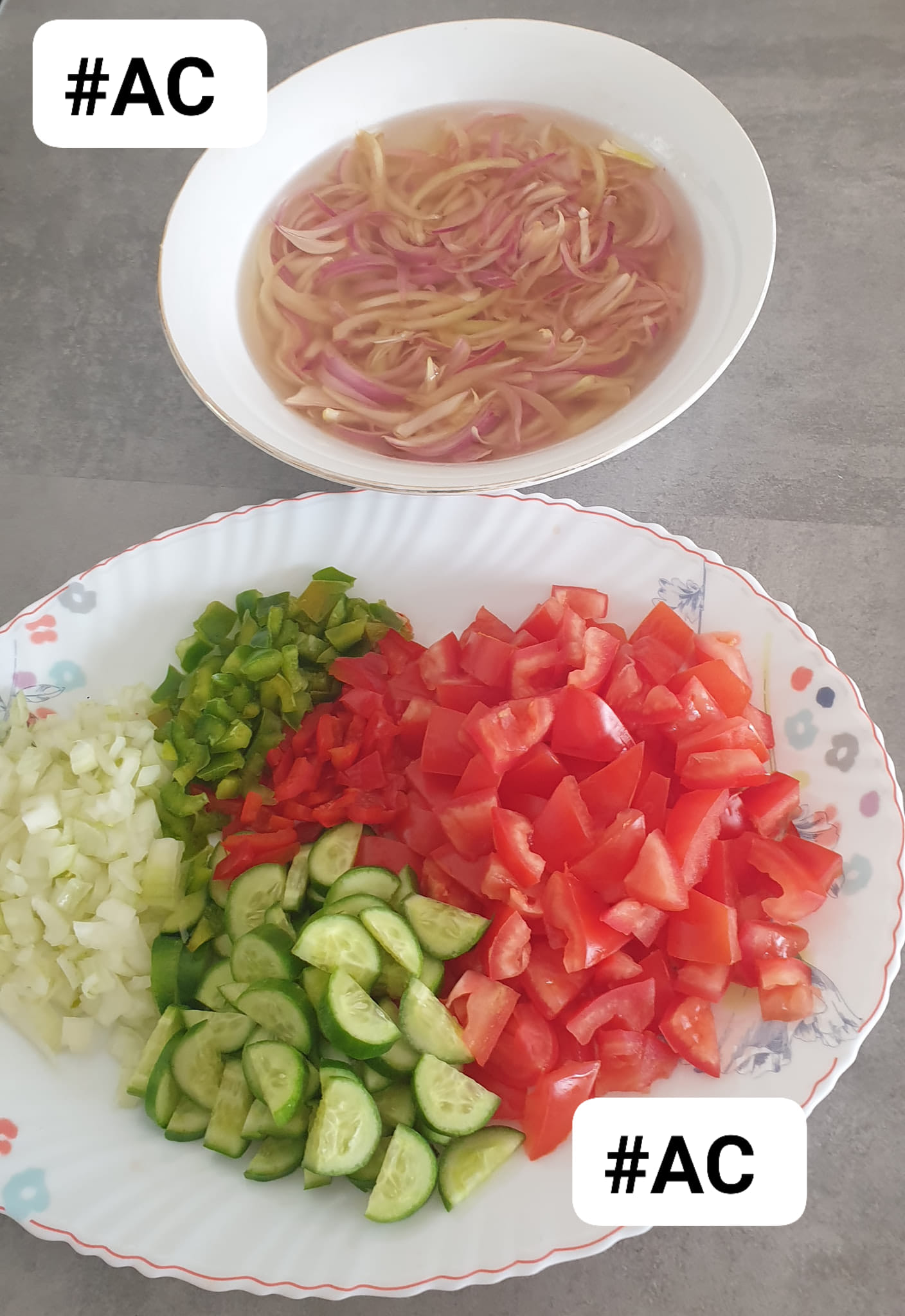 - Préparez une salade fraîche avec des tomates, des oignons, des poivrons rouges et verts, et du concombre.