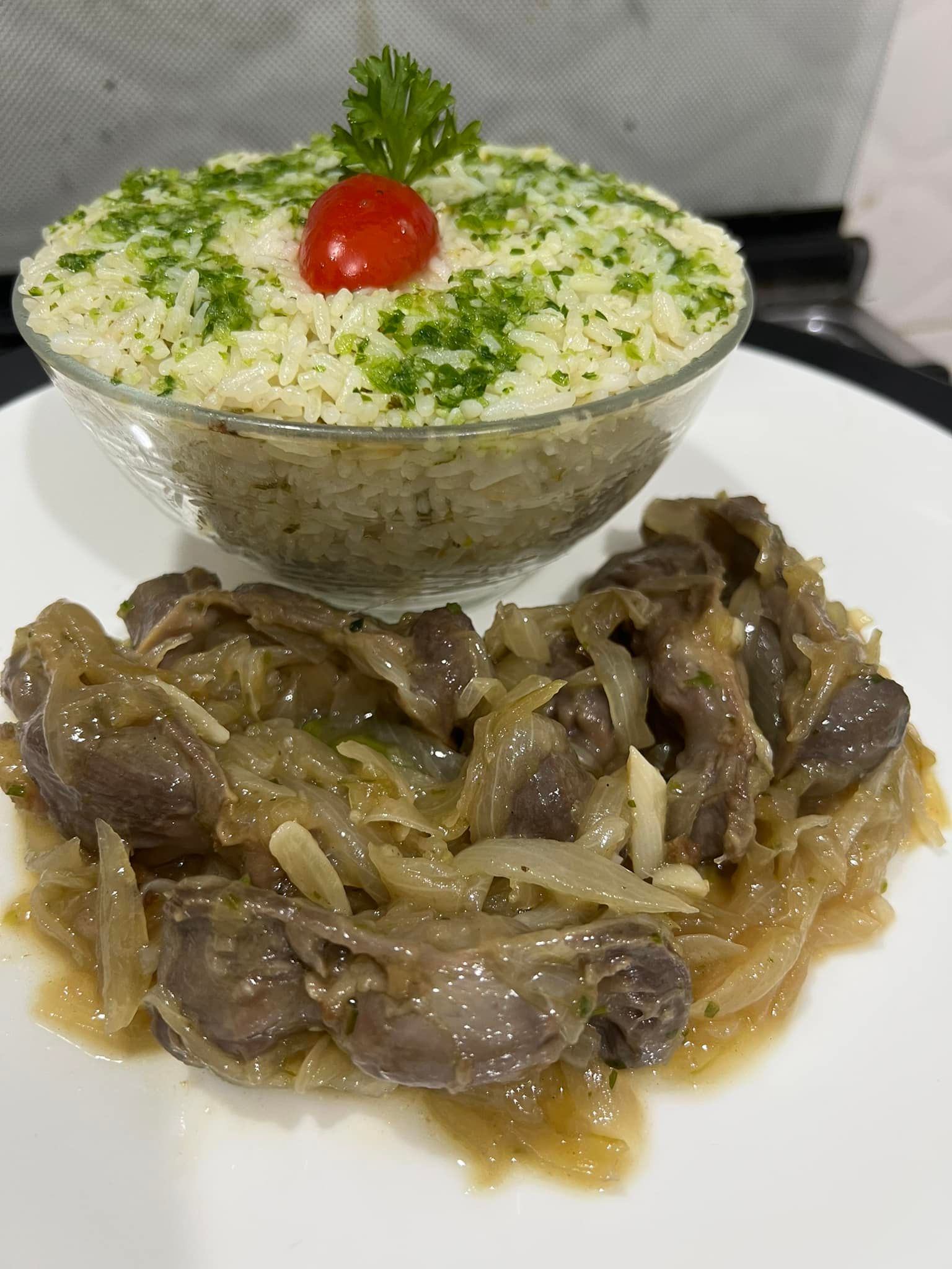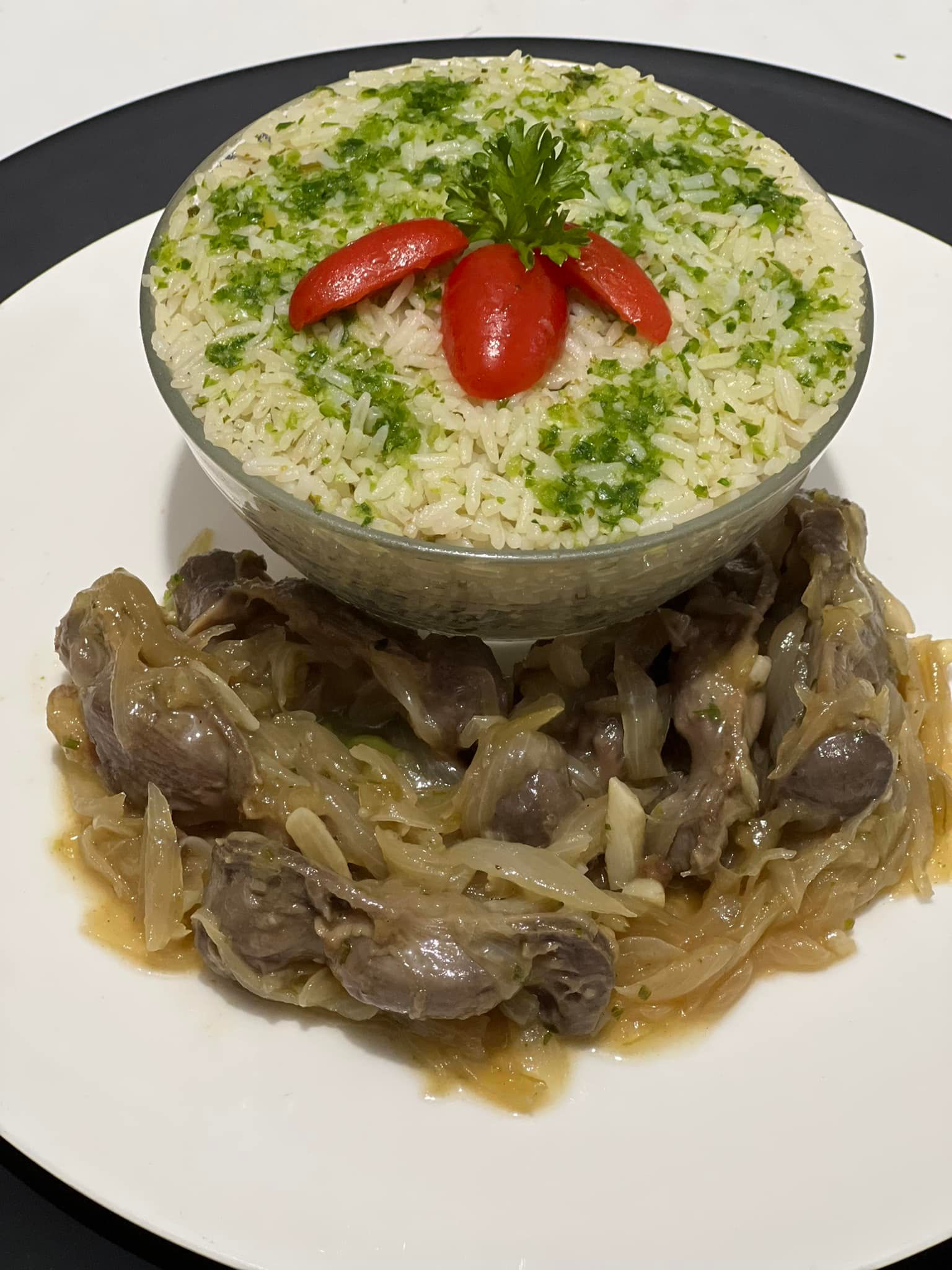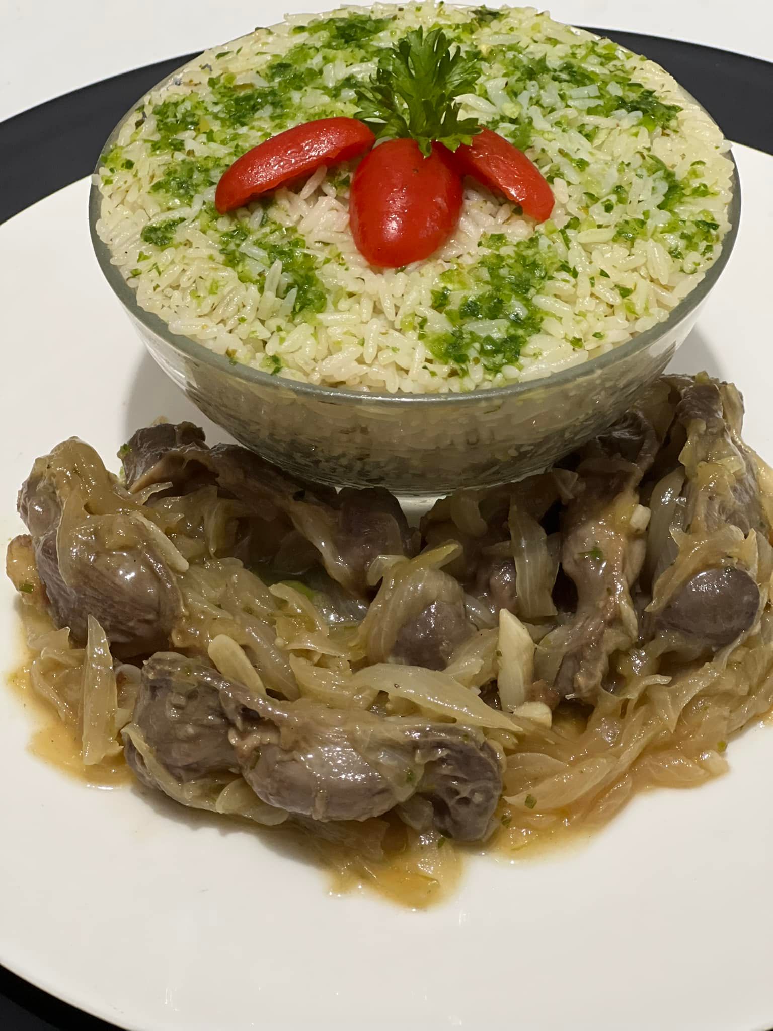 Servez le riz vert chaud, accompagné des gésiers aux oignons caramélisés. Un plat riche en saveurs qui ravira vos papilles !