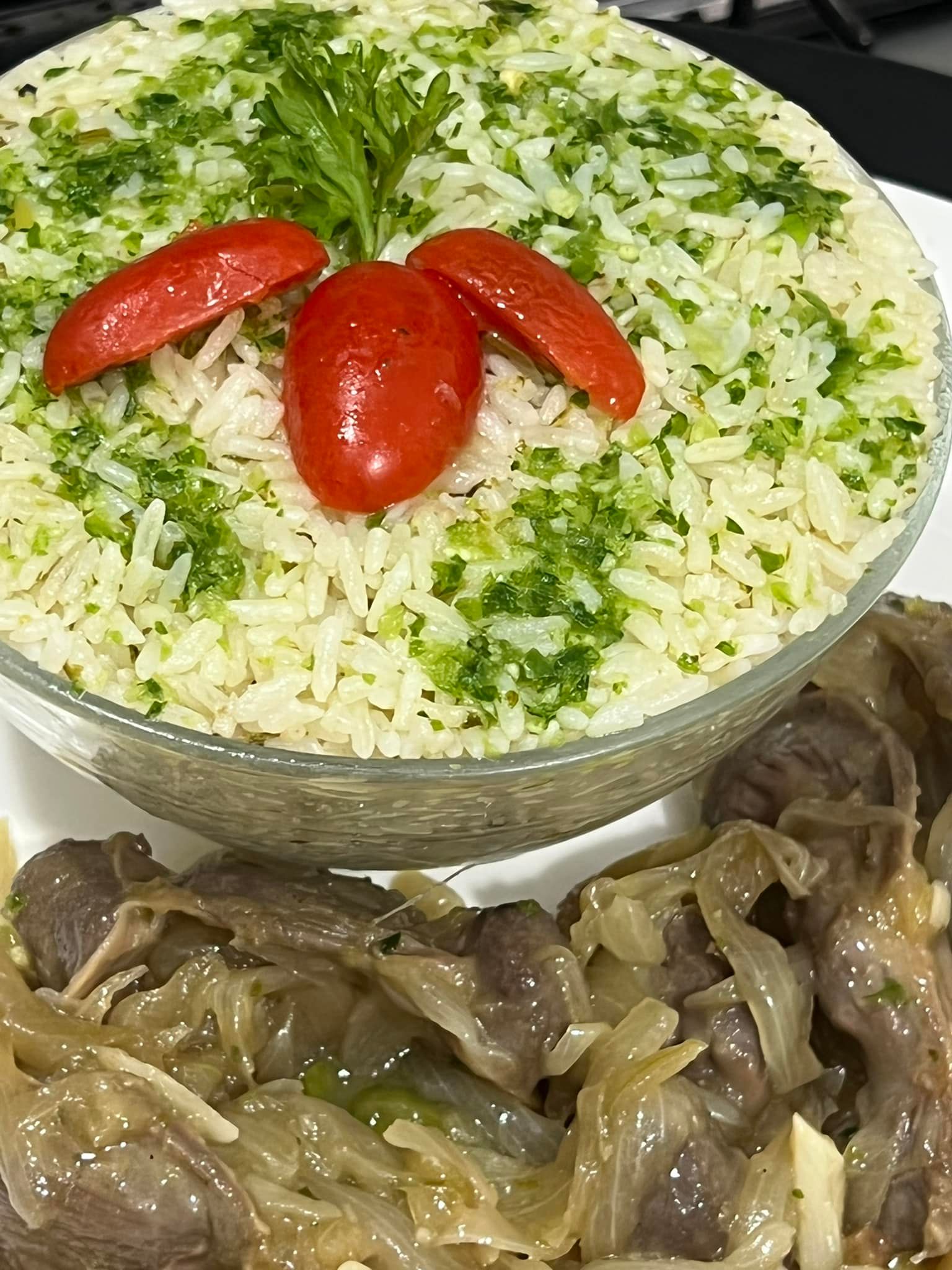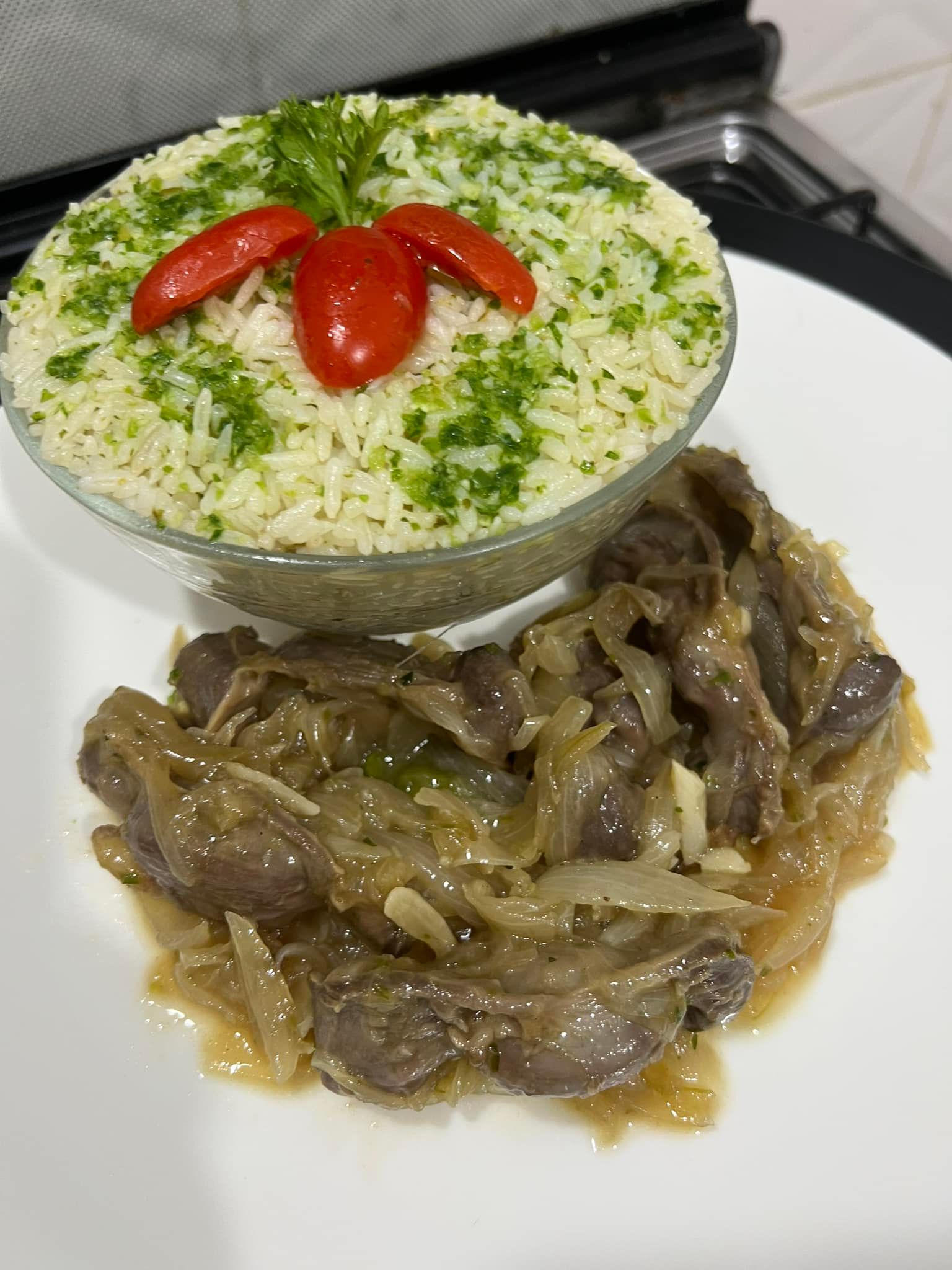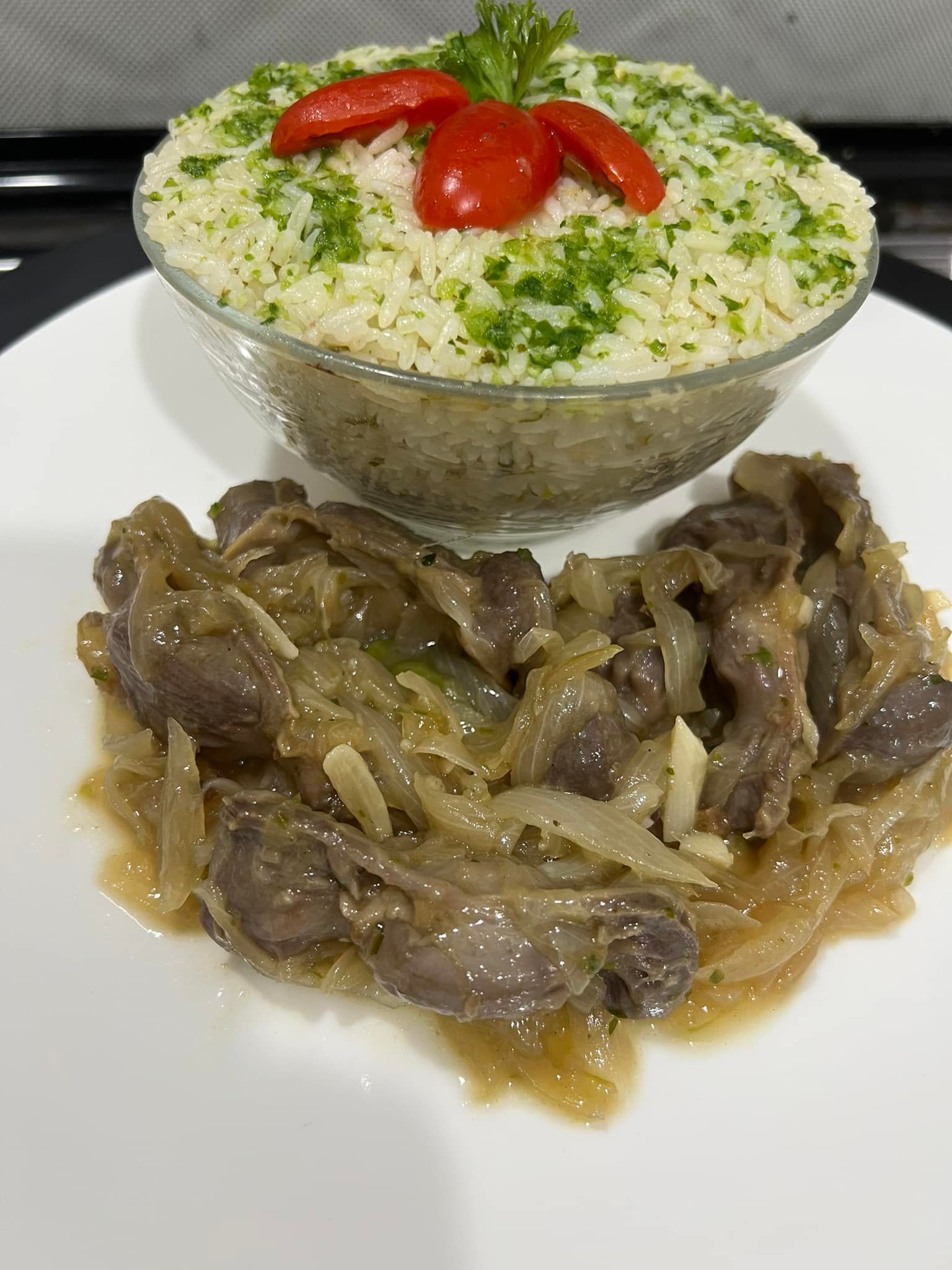 Servez le riz vert chaud, accompagné des gésiers aux oignons caramélisés. Un plat riche en saveurs qui ravira vos papilles !