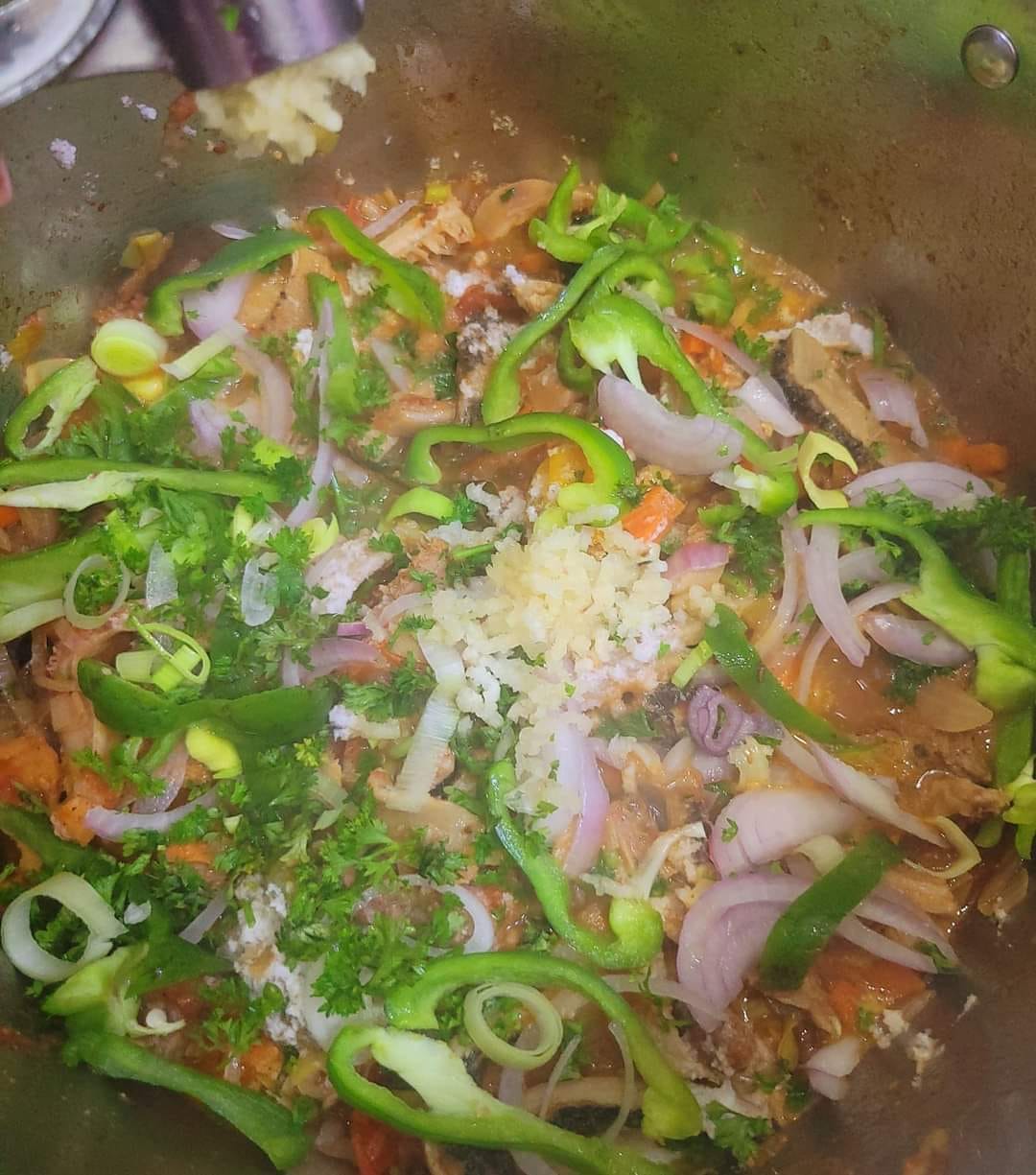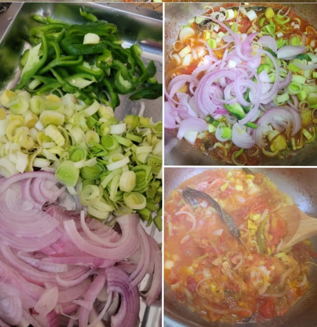 - Intégrez un mélange haché (oignon, poireau, piment), laissez mijoter 5 min et salez.
