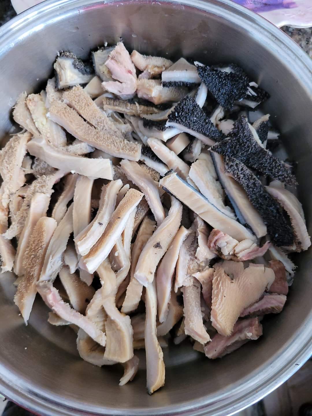 - Dans une marmite, versez les tripes précuites. Ajoutez les feuilles aromatiques (massépodjom, odjom), le piment et le jus d’un citron.