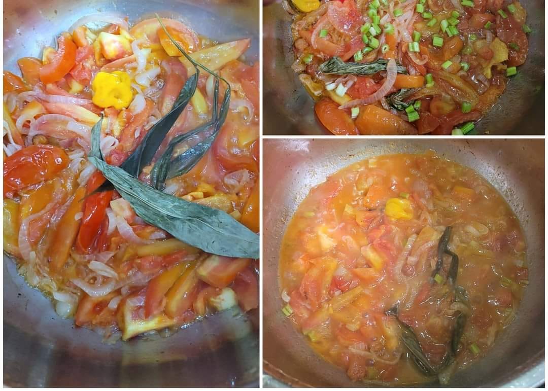 - Ajoutez les tomates grossièrement coupées + 2 feuilles d’odjom. Laissez cuire à mi-cuisson, puis incorporez une tige de céleri pour atténuer l’acidité.