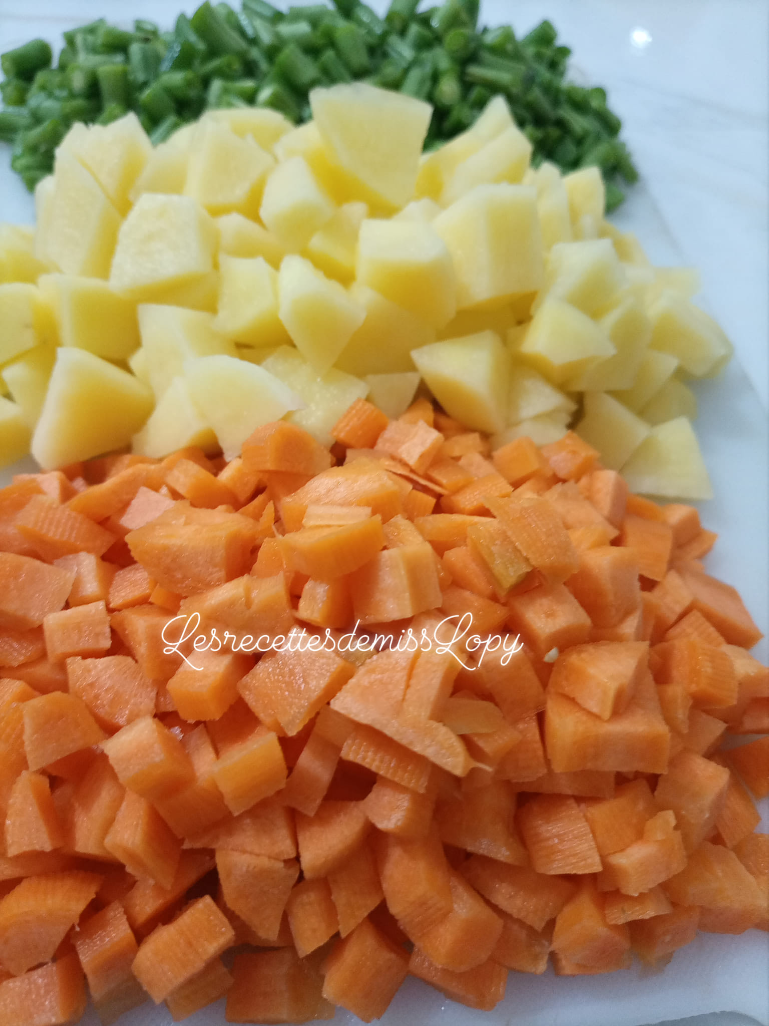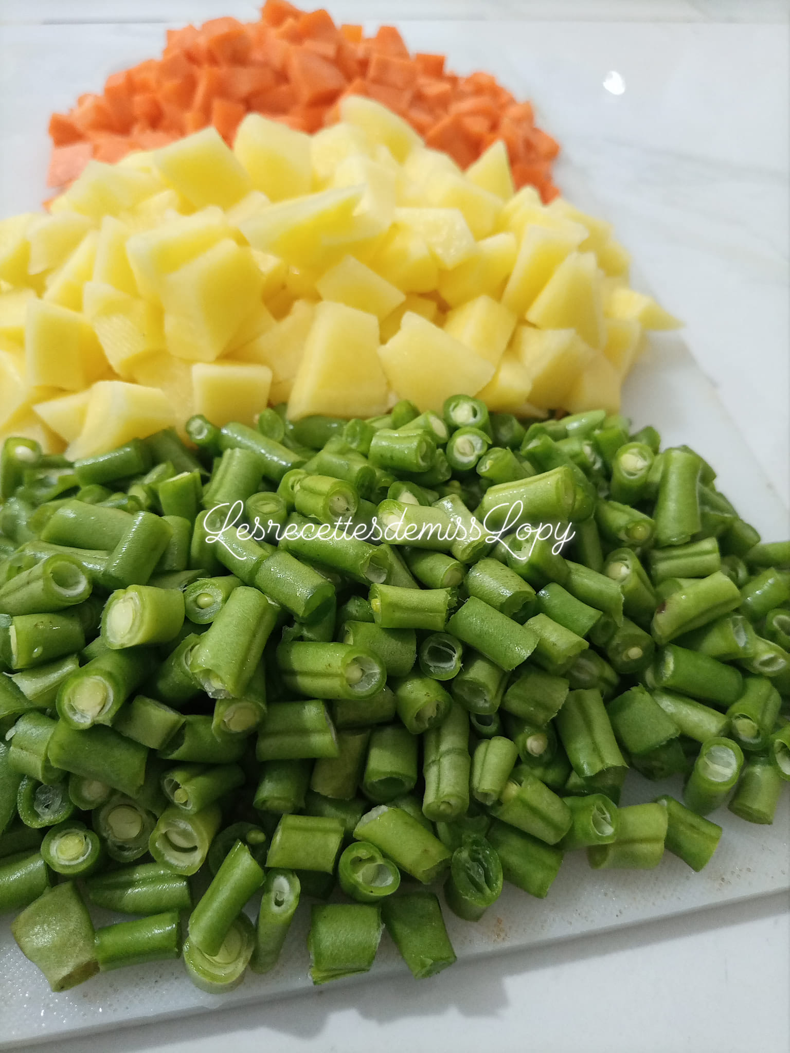 - Dans une autre casserole cuire les carottes et les haricots verts dans l’eau bouillante salée. Égoutter et réserver.
