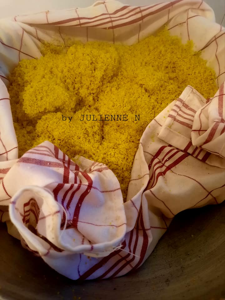 - Vider de nouveau, le fonio dans le bol, égrener avec la louche, puis mouiller avec 250 ml d’eau, égrener et mouiller de nouveau avec 15 cl d’eau colorée de 10 g de colorant alimentaire jaune. Remettre dans la couscoussière encore 20 minutes.