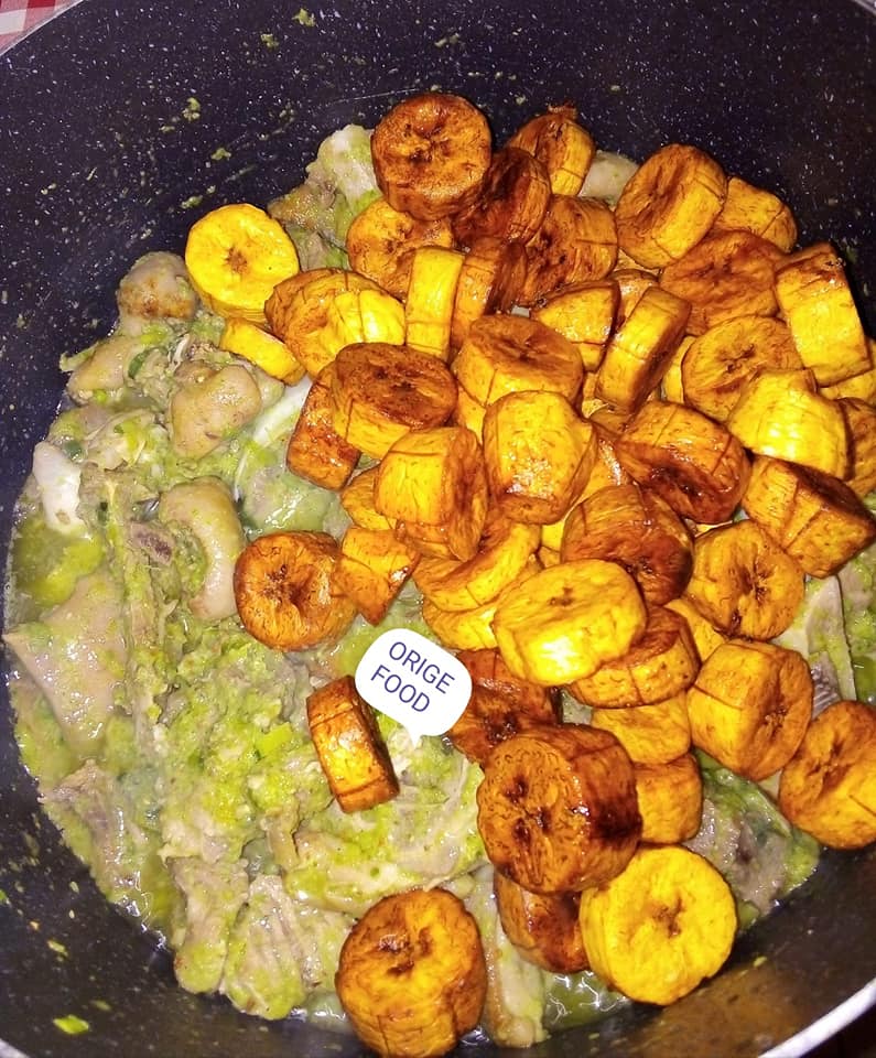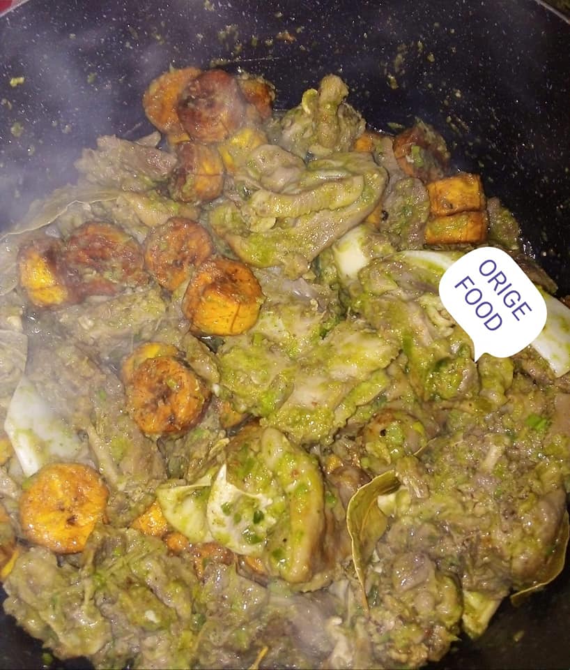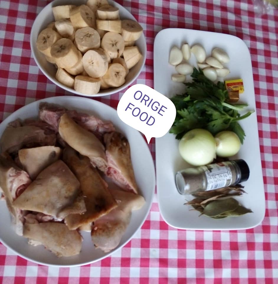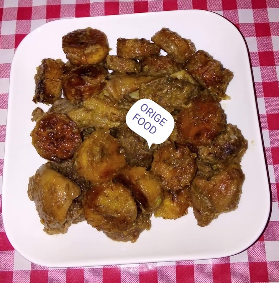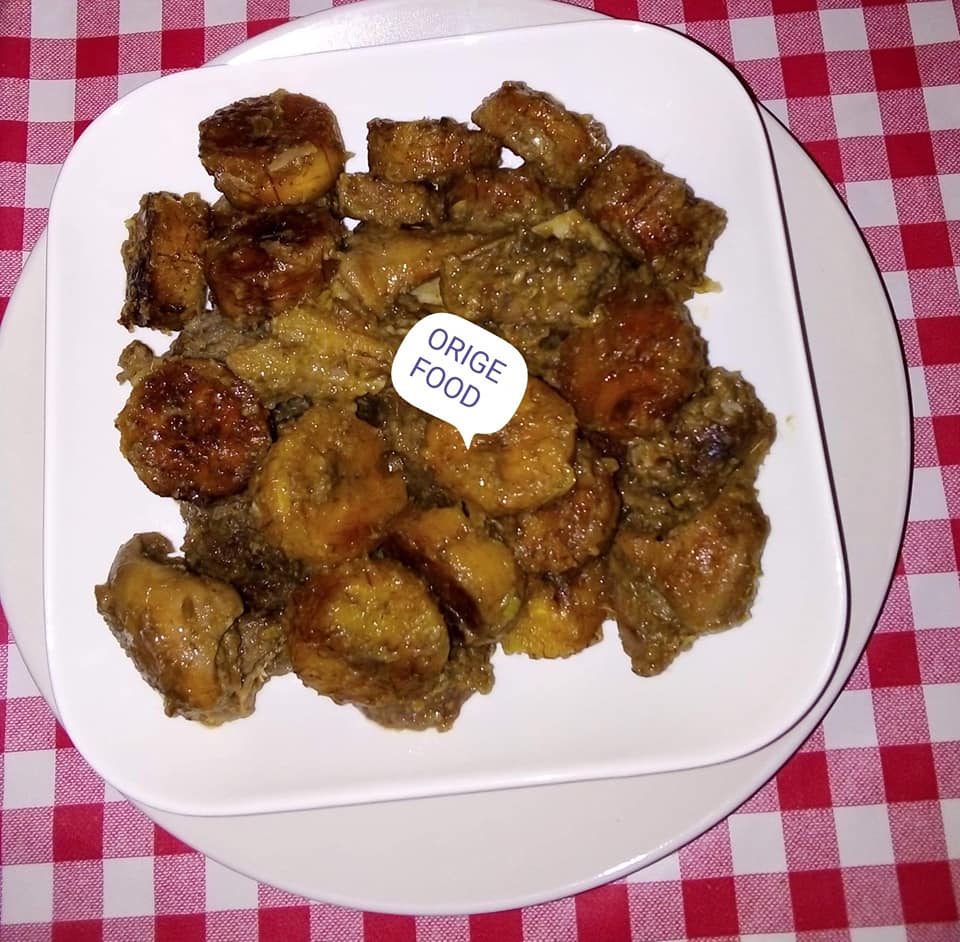 - Mettre de huile dans une casserole rajouter la viande et les condiments mélanger avec du sel et du cube rajouter les banane plantain rajouter un peu d’eau laissé mijoter.