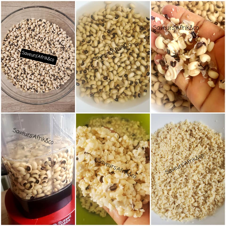 - Puis, le lendemain, enlever la peau des haricots en les frottant entre les mains ou en les cocassant dans un blender avec de l’eau. Ensuite, rincer plusieurs fois, afin d’avoir des haricots tout blancs et entièrement dépourvus de leurs enveloppes noirs. Repeter l’opération autant que nécessaire.
