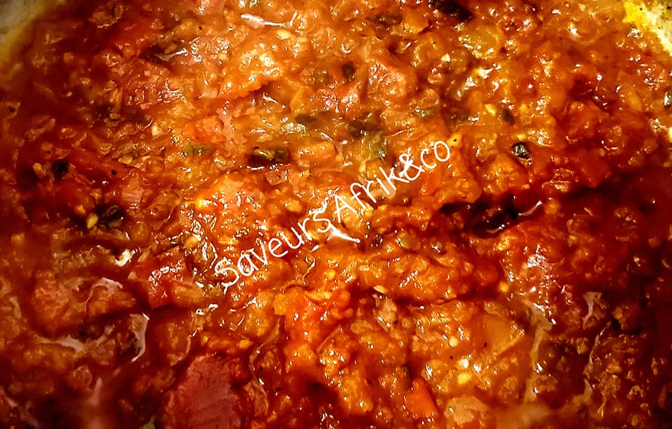 - Dans une poêle, faites roussir la mixture dans de l’huile. Ajouter ensuite, un peu d’eau si nécessaire, la tomate concentrée et laisser mijoter pendant 10 min un verre d’eau tout en remuant de régulièrement la sauce. Poivrer, saler, puis rectifier l’assaisonnement.