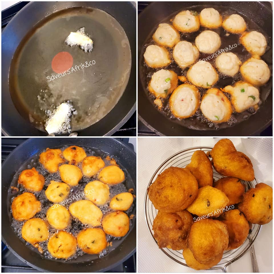 - Bien chauffer l’huile et à l’aide d’une cuillère, prendre une purée et frire vos beignets pendant 2 min sur chaque côté.