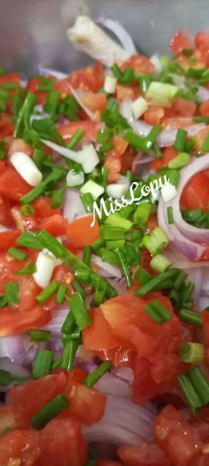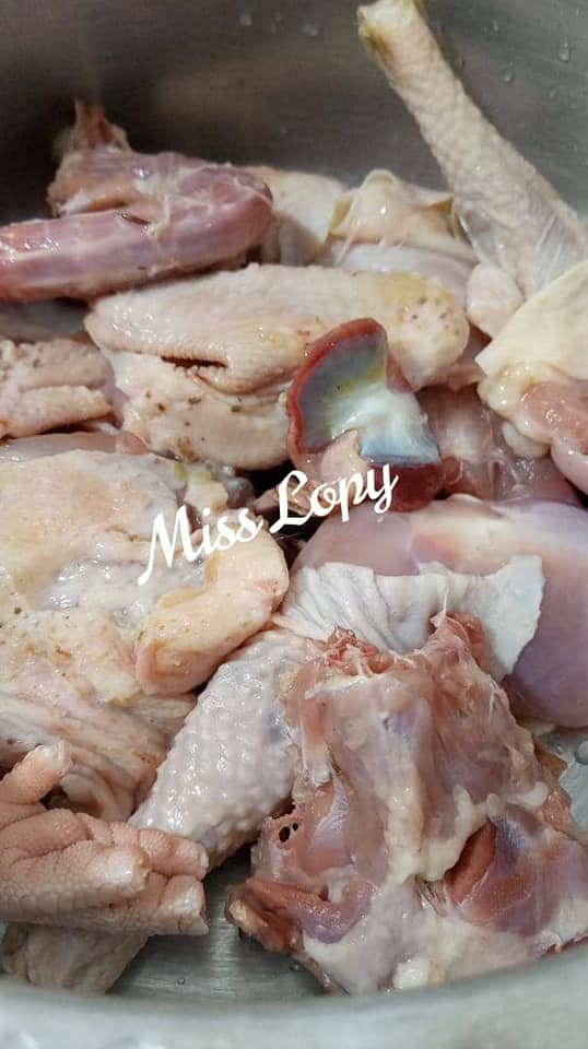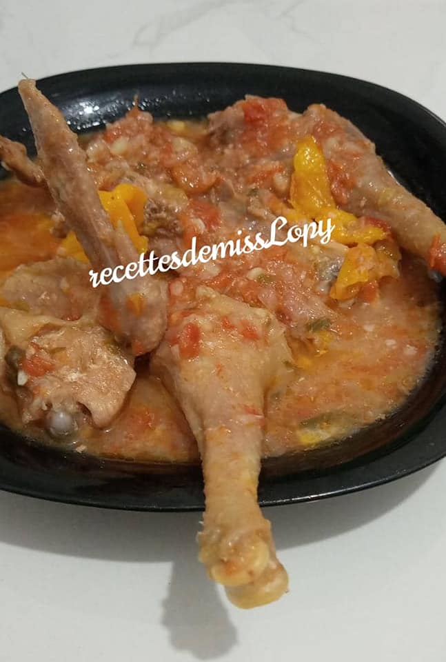 - Découper les légumes. Et les renverser sur les morceaux de poulet dans notre marmite déjà tapissée avec de feuille . Saler mélanger l’ensemble et couvrir avec les feuilles.