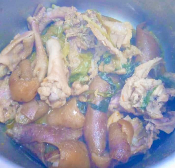 - D’un autre côté cuire son poulet avc les ingrédients cités plus haut . Quand c presque cuit y ajouter la peau 10minuts avant d’éteindre