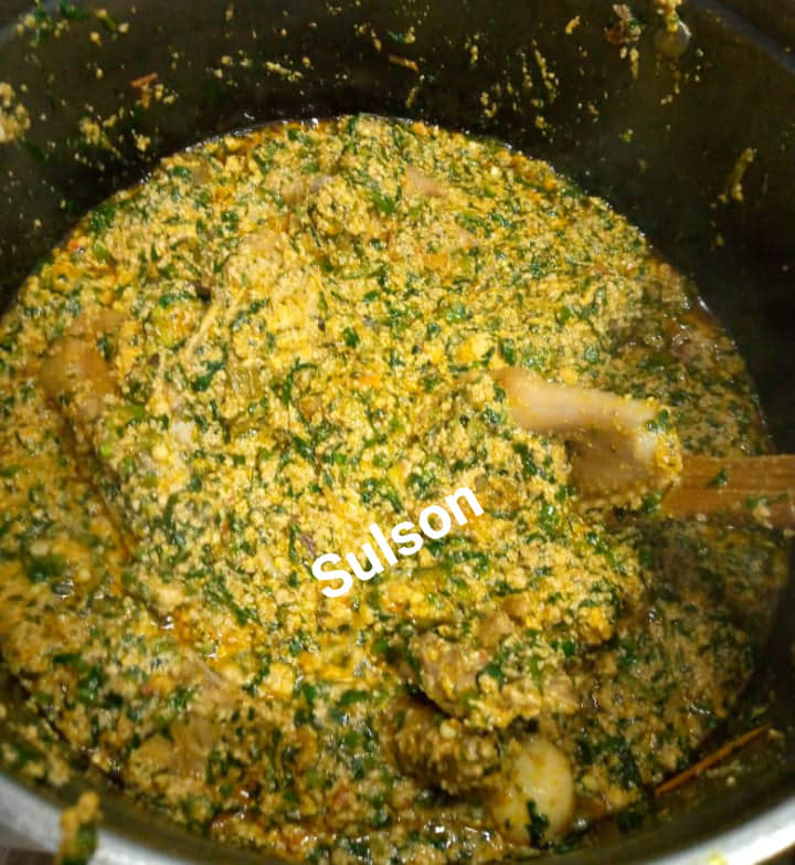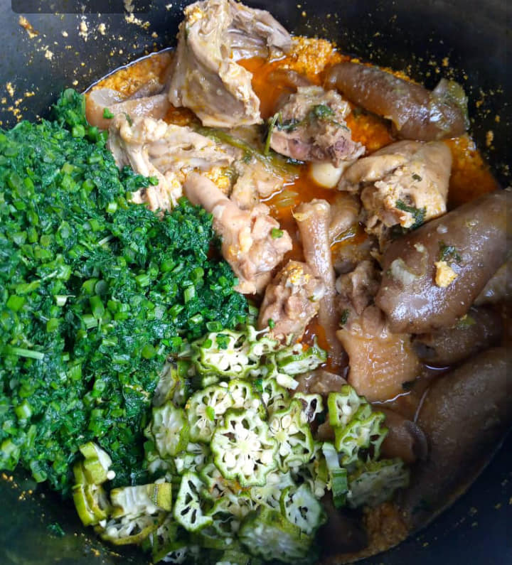 - Quand le pistache est cuit ,ajoutez vos légumes q vous aurez fait bouillir au préalable (sauf pour les epinard qu’on peut ajouter directement ) . Moi j’ai mis ozom.cuit plus gombo.