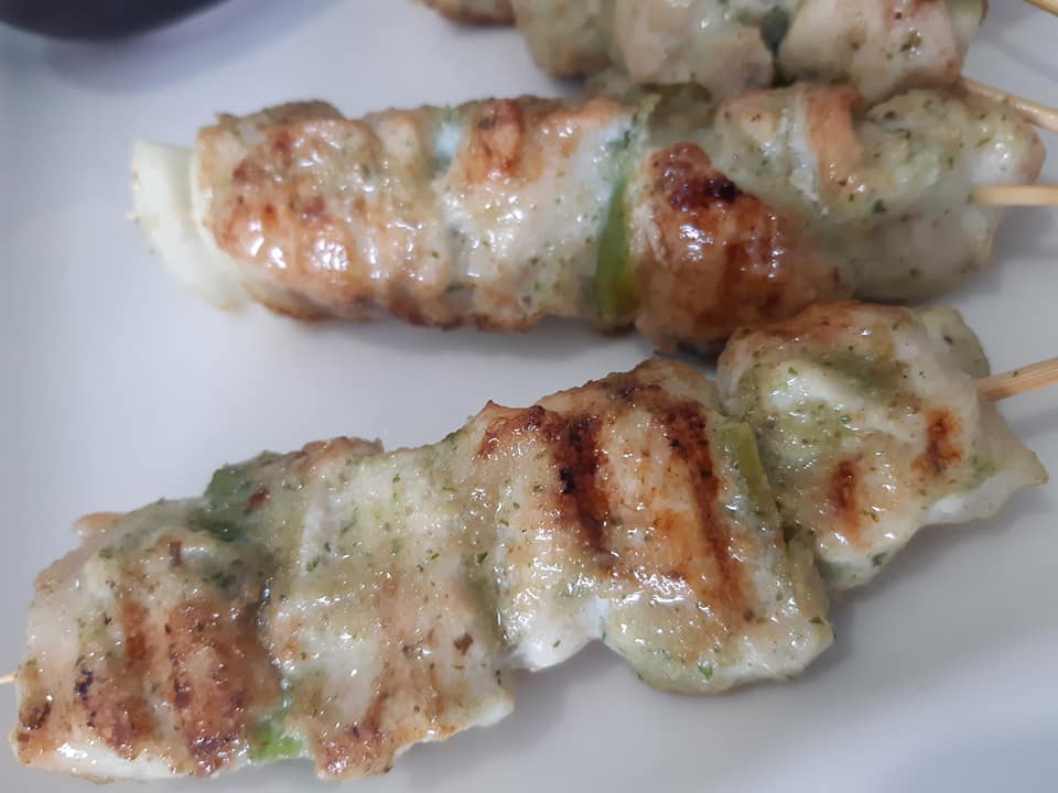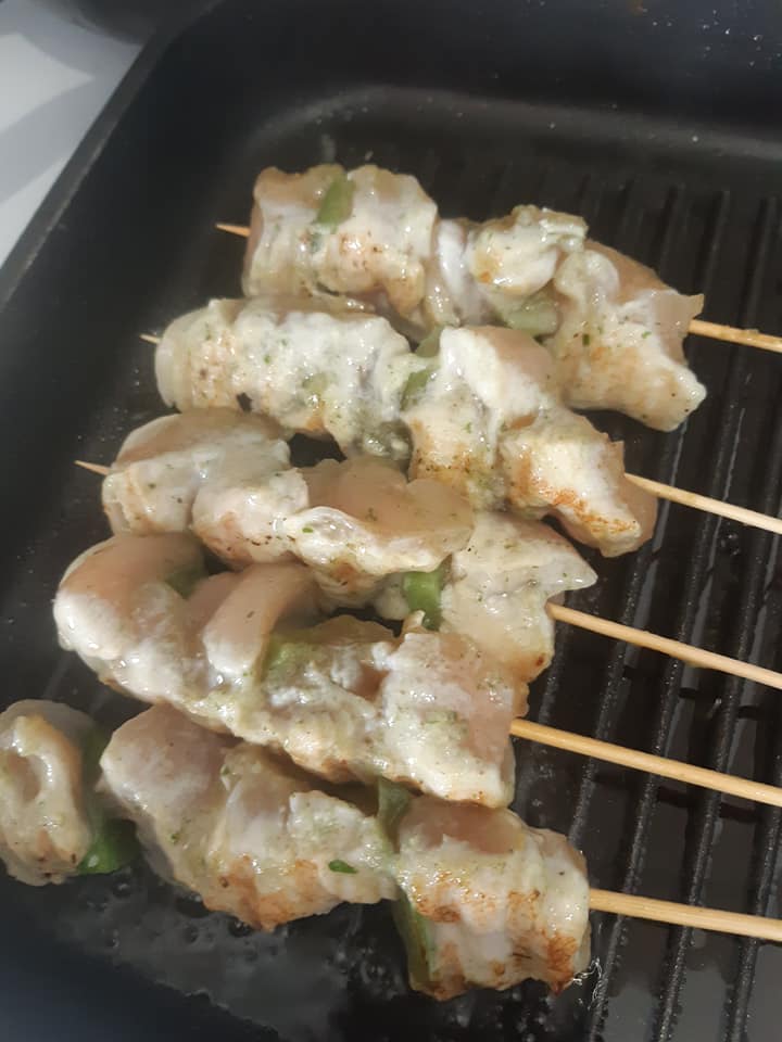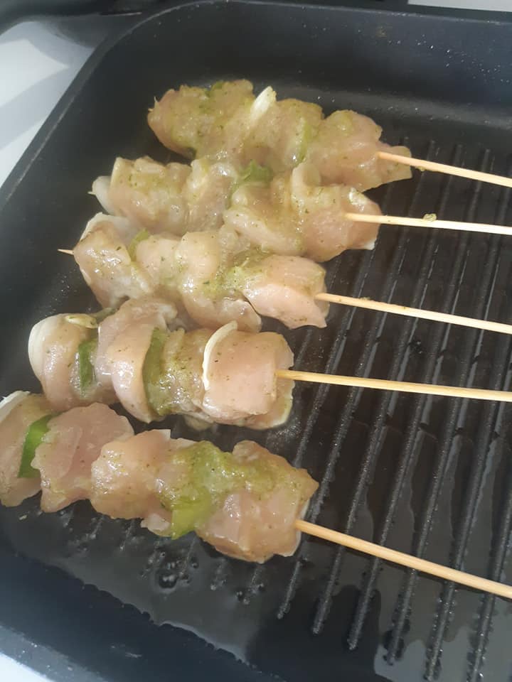 - Enfiler les morceaux de poulet sur les broches en prenant soin d alterner avec du poivron et des oignons