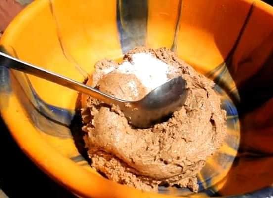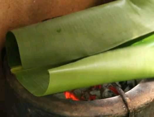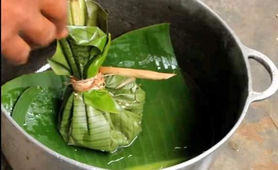 - Sans cesser de remuer, salez et pimentez. Formez une boule avec le mélange, mettez-la dans les feuilles de bananier