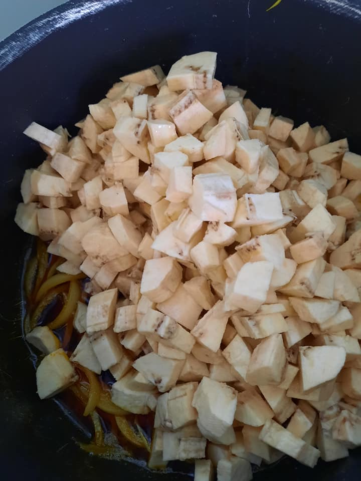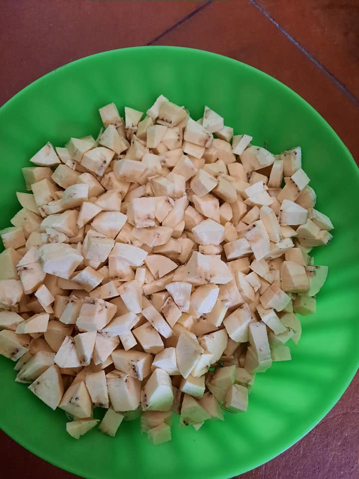 - Eplucher les plantains et Découper en dé ou selon votre convenance larver et réserver.