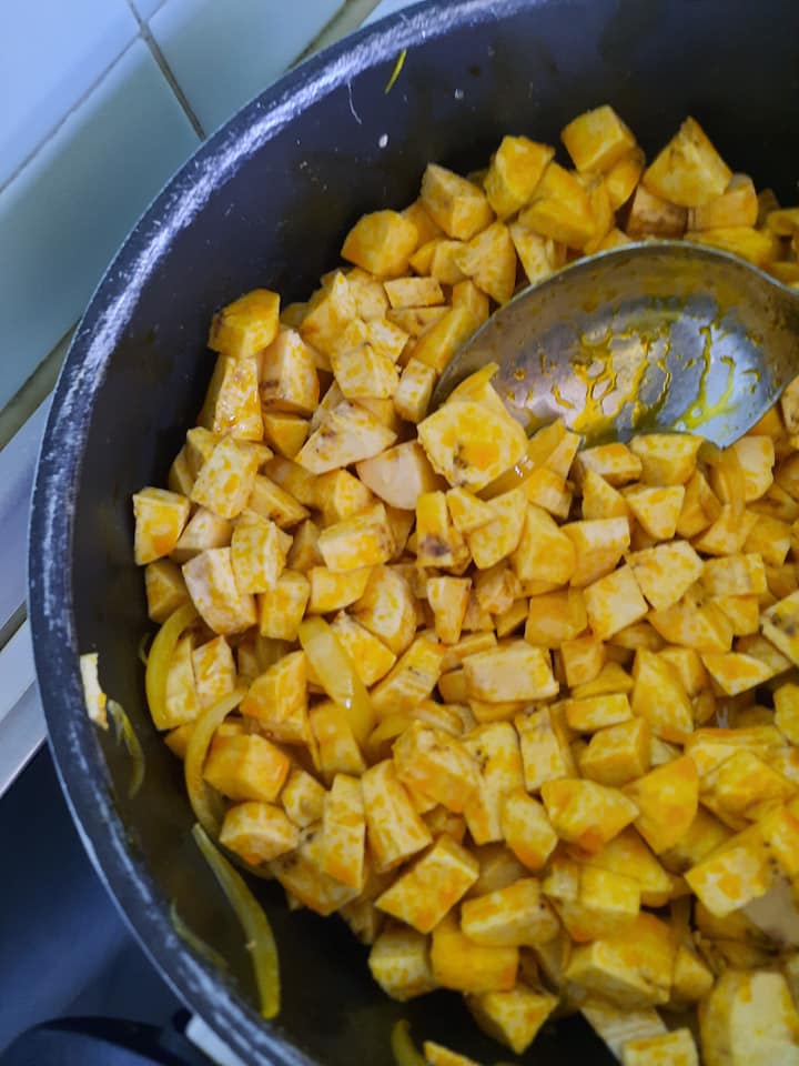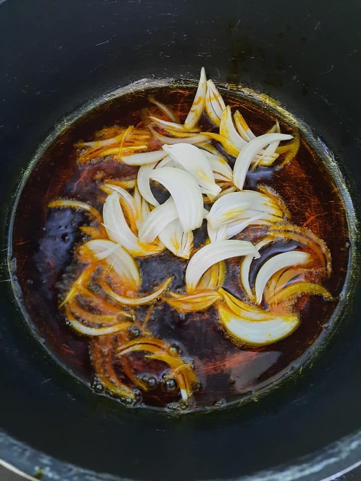 - Mettre votre marmite au feu et y ajouter l’huile de palme dès qu’elle est chaude (attention a ne pas la blanchir juste chauffer) ajouter les oignons préalablement découpés et laisser mijoter 3 à 5min puis ajouter les plantains et bien tourner.