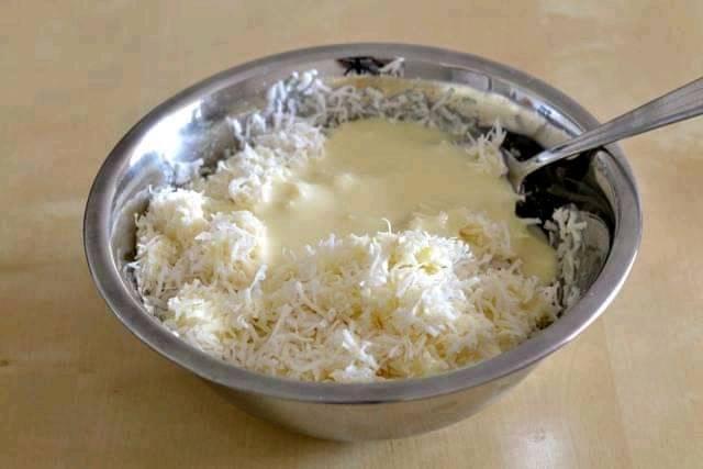 - Etape 1:Mélanger la noix de coco et le lait concentré sucré.