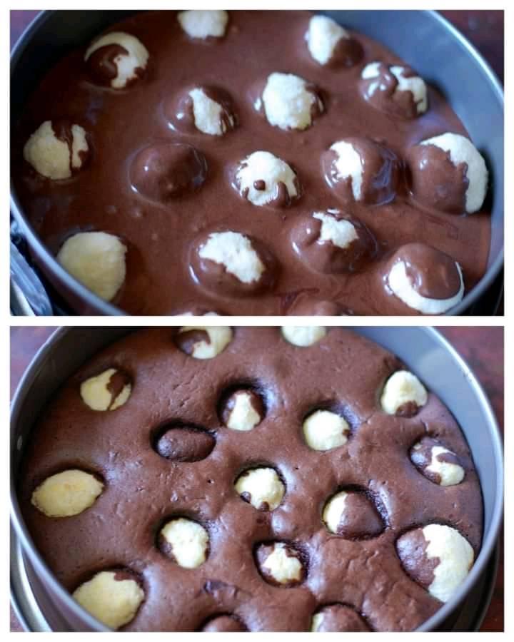 Vous pouvez diviser la pâte de chocolat en deux. Verser la première partir puis déposer les boules de noix de coco et enfin verser la deuxième partie de la pâte. Là c’est si vous voulez que vos boules reste au milieu car les boules descendent a la cuisson.