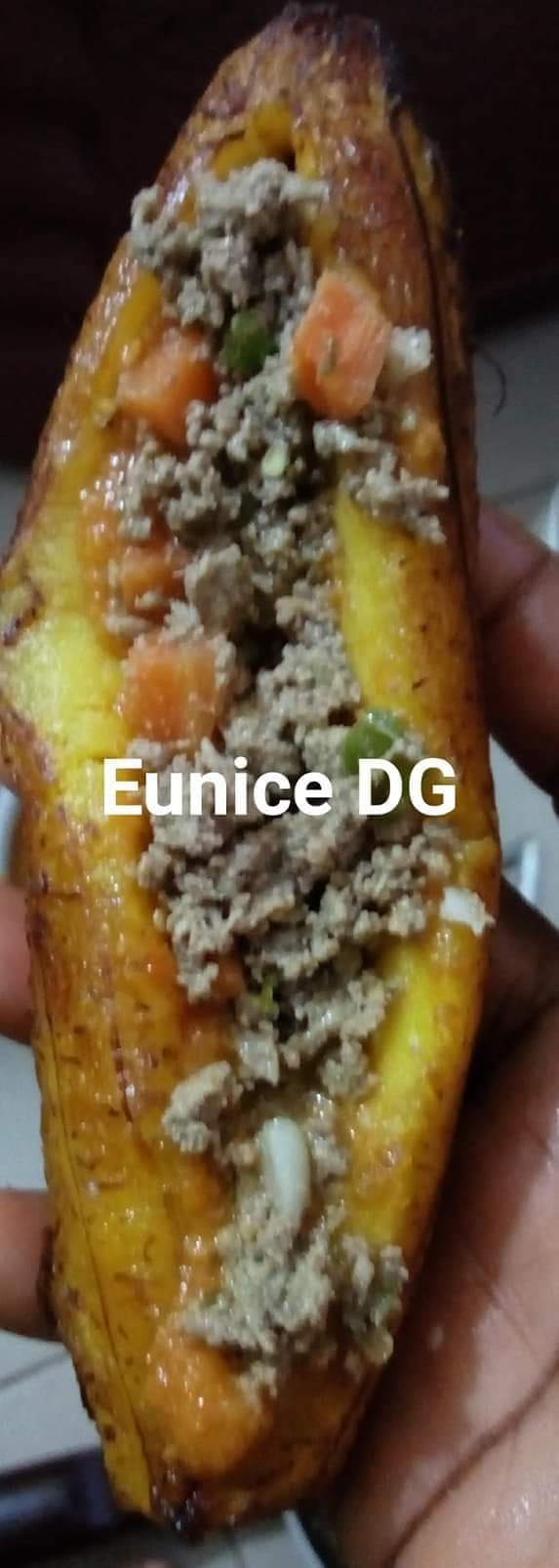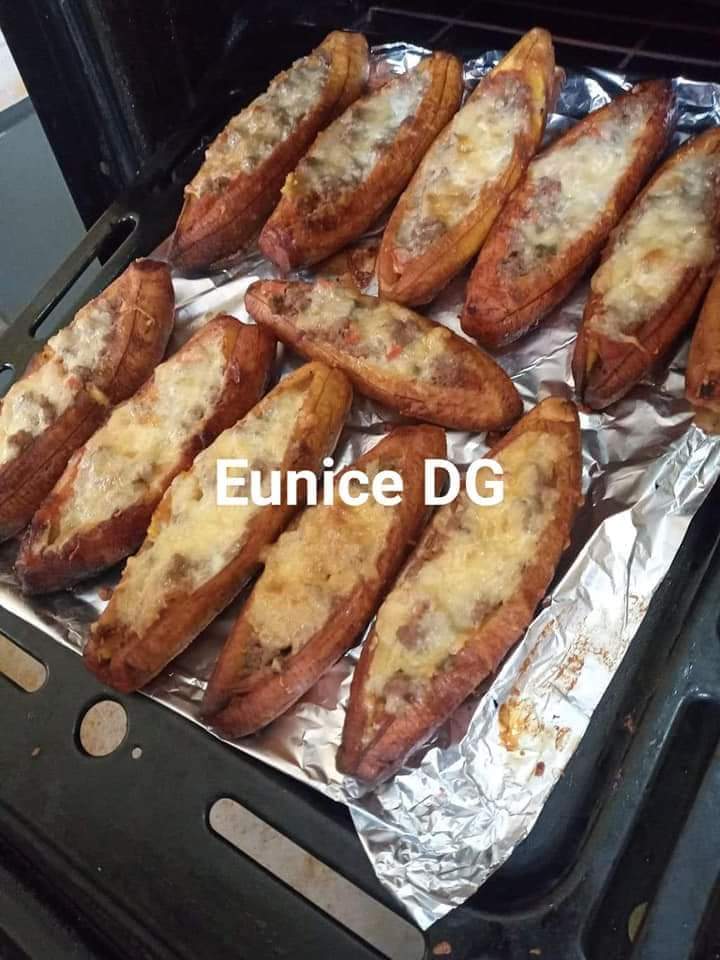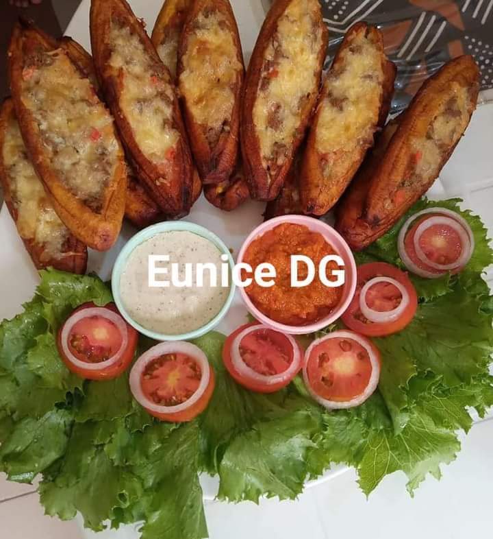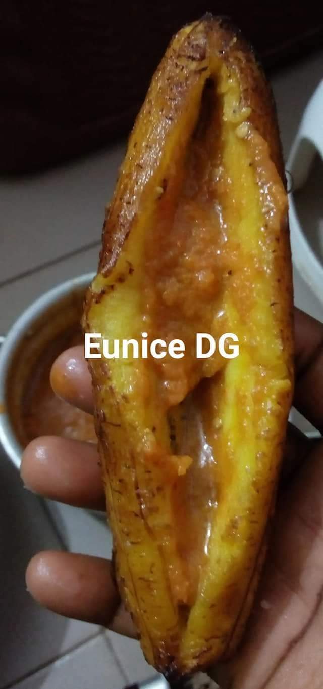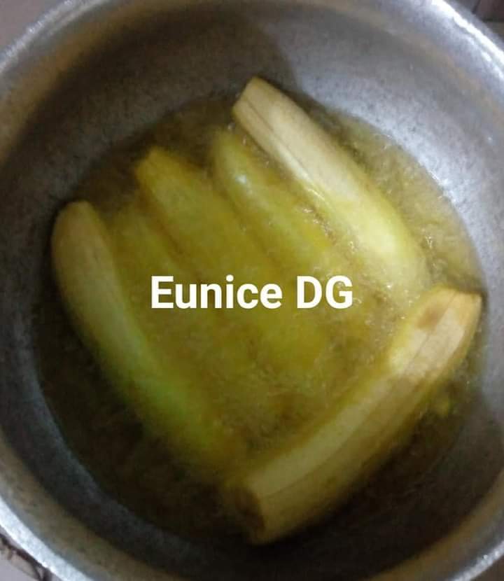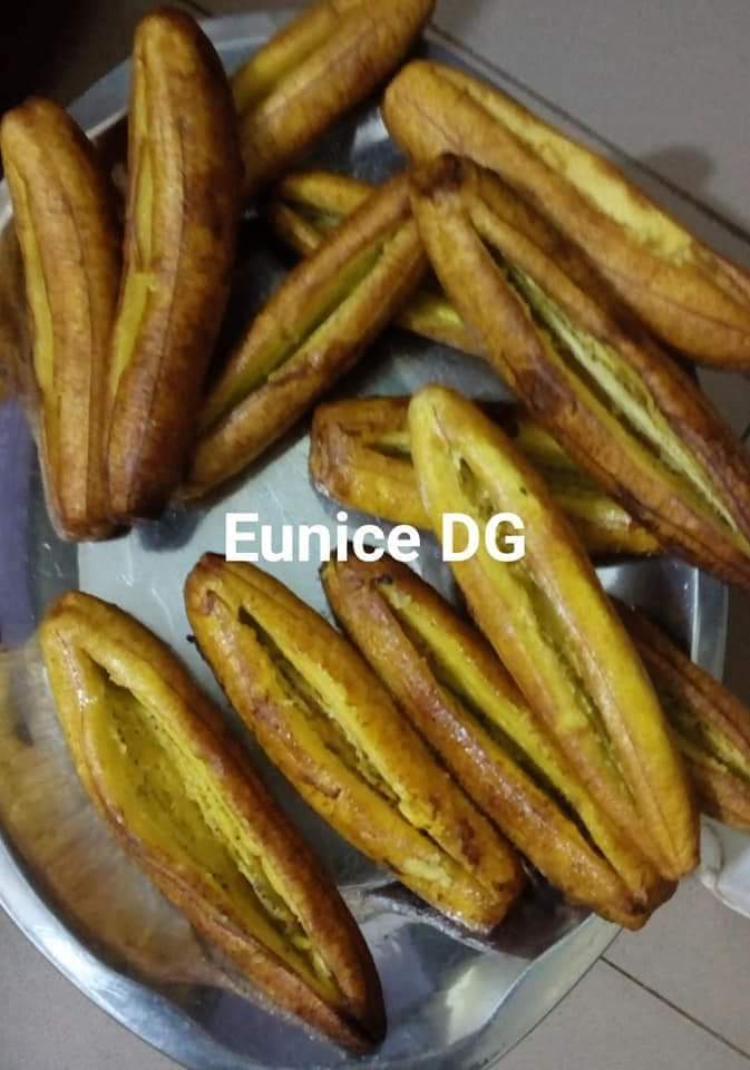 - Epluchez les bananes plantain, faites frire jusqu’à ce que ça soit doré. Laissez refroidir, fendre le milieu pour mettre la farce