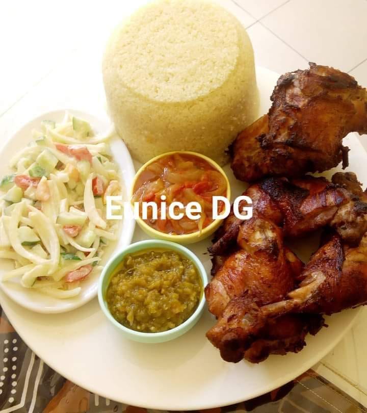 Servez le poulet frit sur un lit d'attiéké, accompagné de légumes grillés et d'une sauce tzatziki fraîche pour rehausser les saveurs.