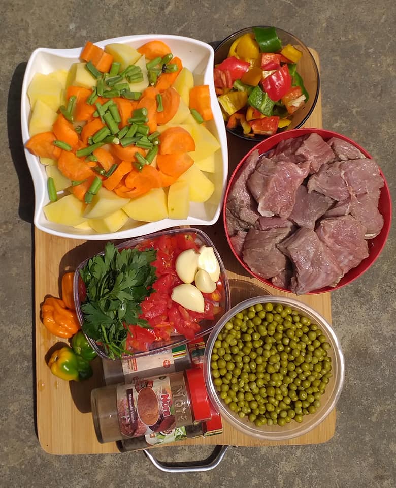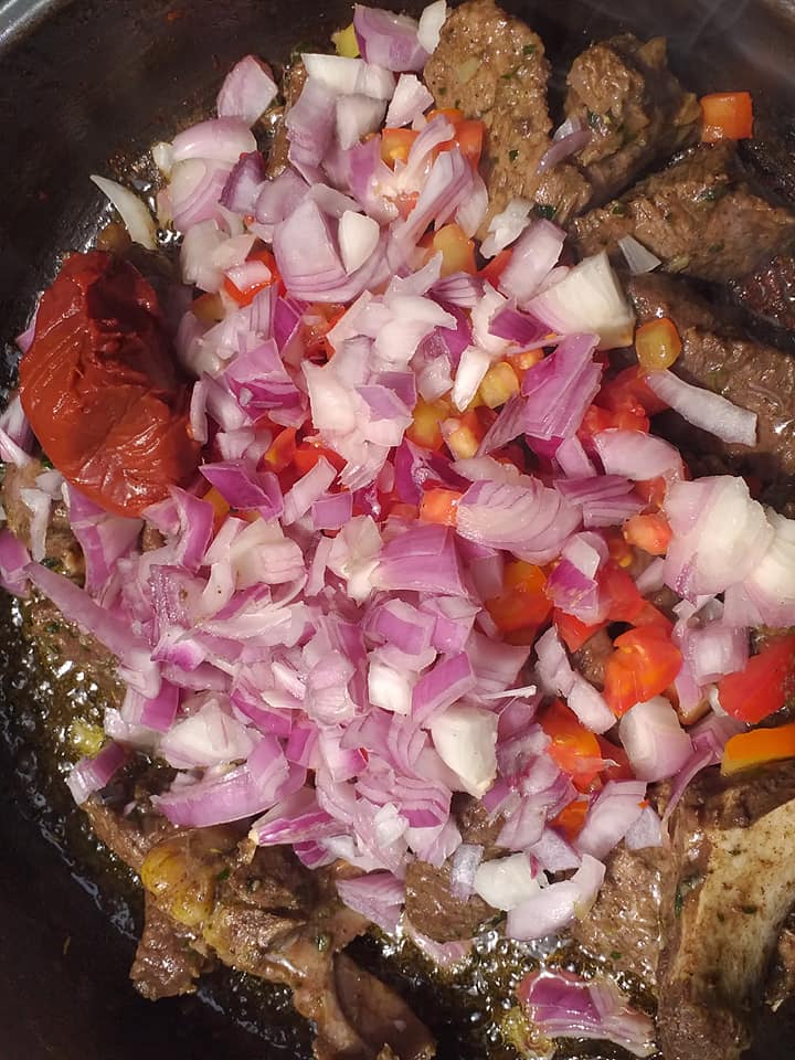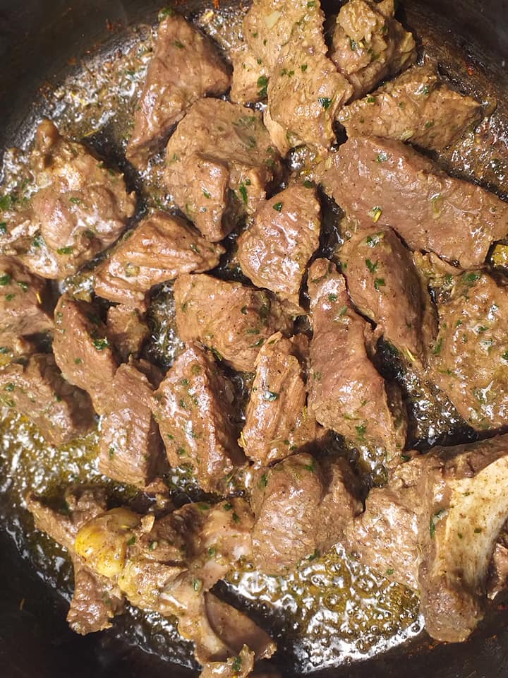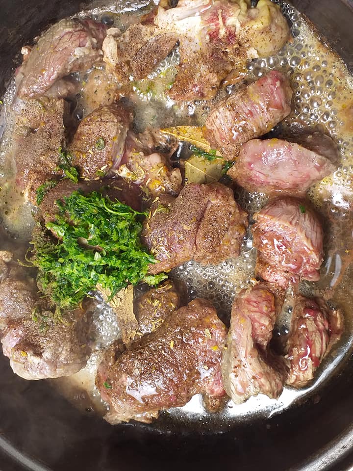 D’abord, faites revenir la viande dans une grande casserole, ajoutez-y du sel ail et persil écrasé, poivre en poudre Nora, herbes de Provence.