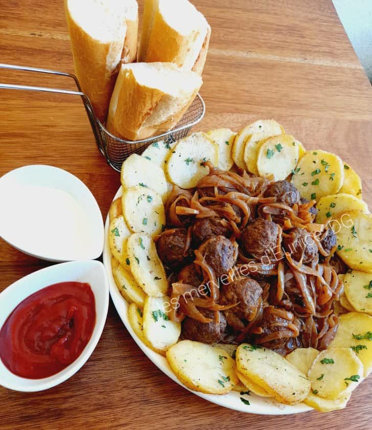 - Renversez les oignons dans la marmite, laissez mijoter 10 mn, ensuite ajoutez un petit verre d’eau pour que les oignons cuisent un peu. Après cette étape, ajoutez vos boulettes de viande.