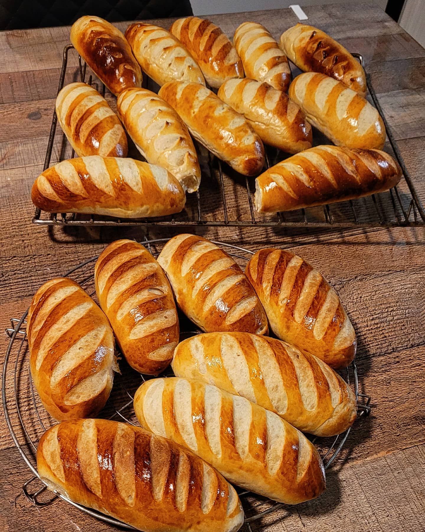 - Faites cuire 8 à 10 min jusqu’à ce que les pains soient bruns dorés foncés.