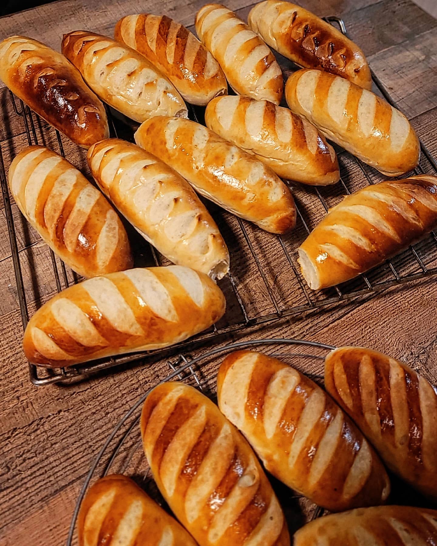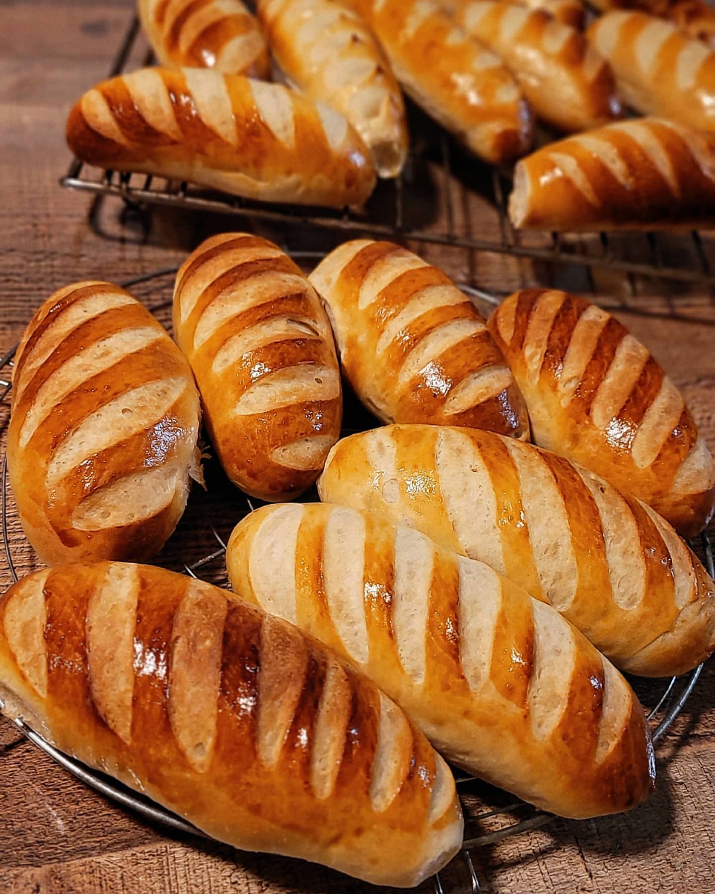 - Dorez les petits pains avec le mélange œuf battu/lait, puis avec la lame d’un rasoir ou d’un petit couteau, pratiquez sur chaque pâton des entailles.