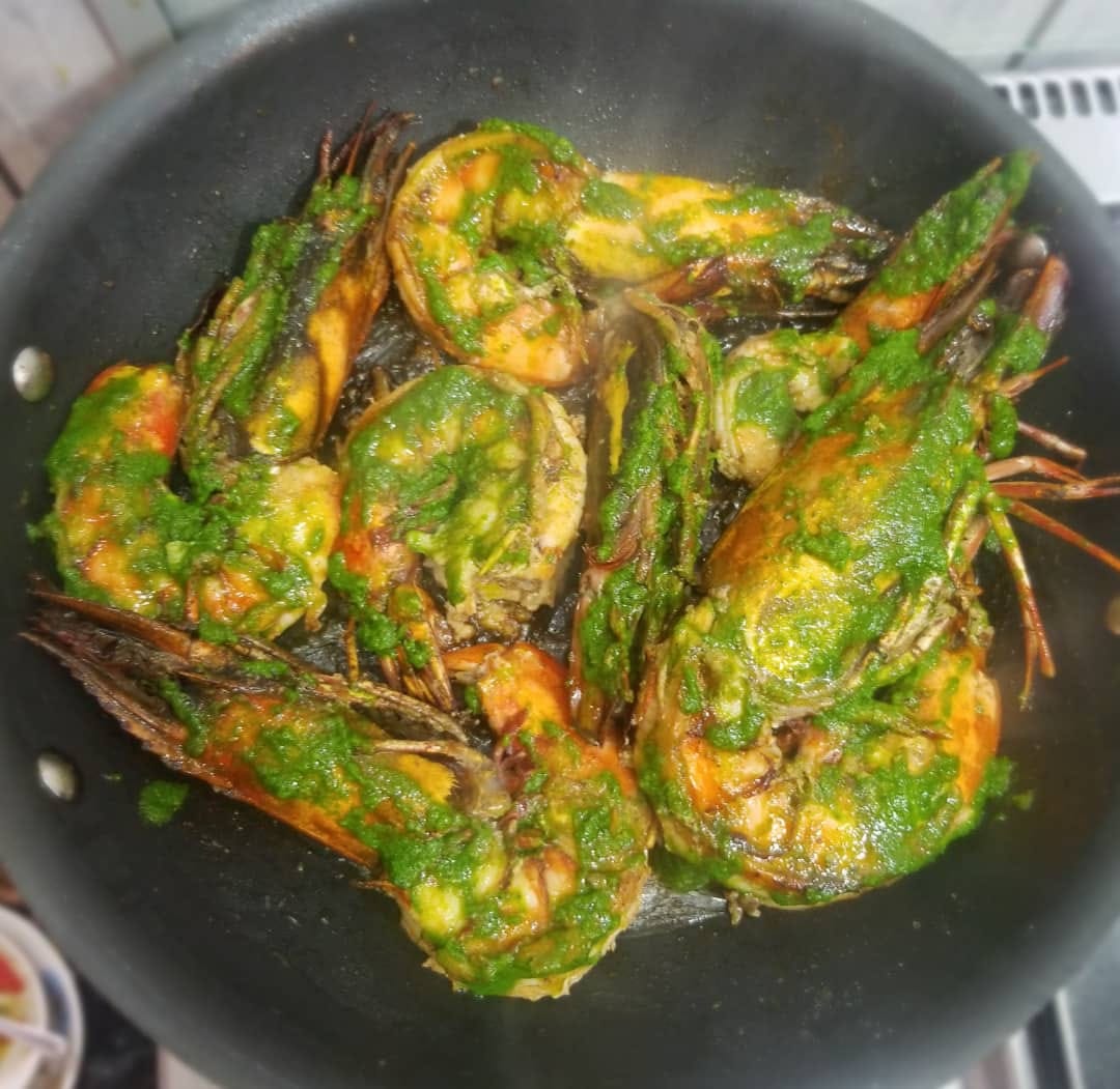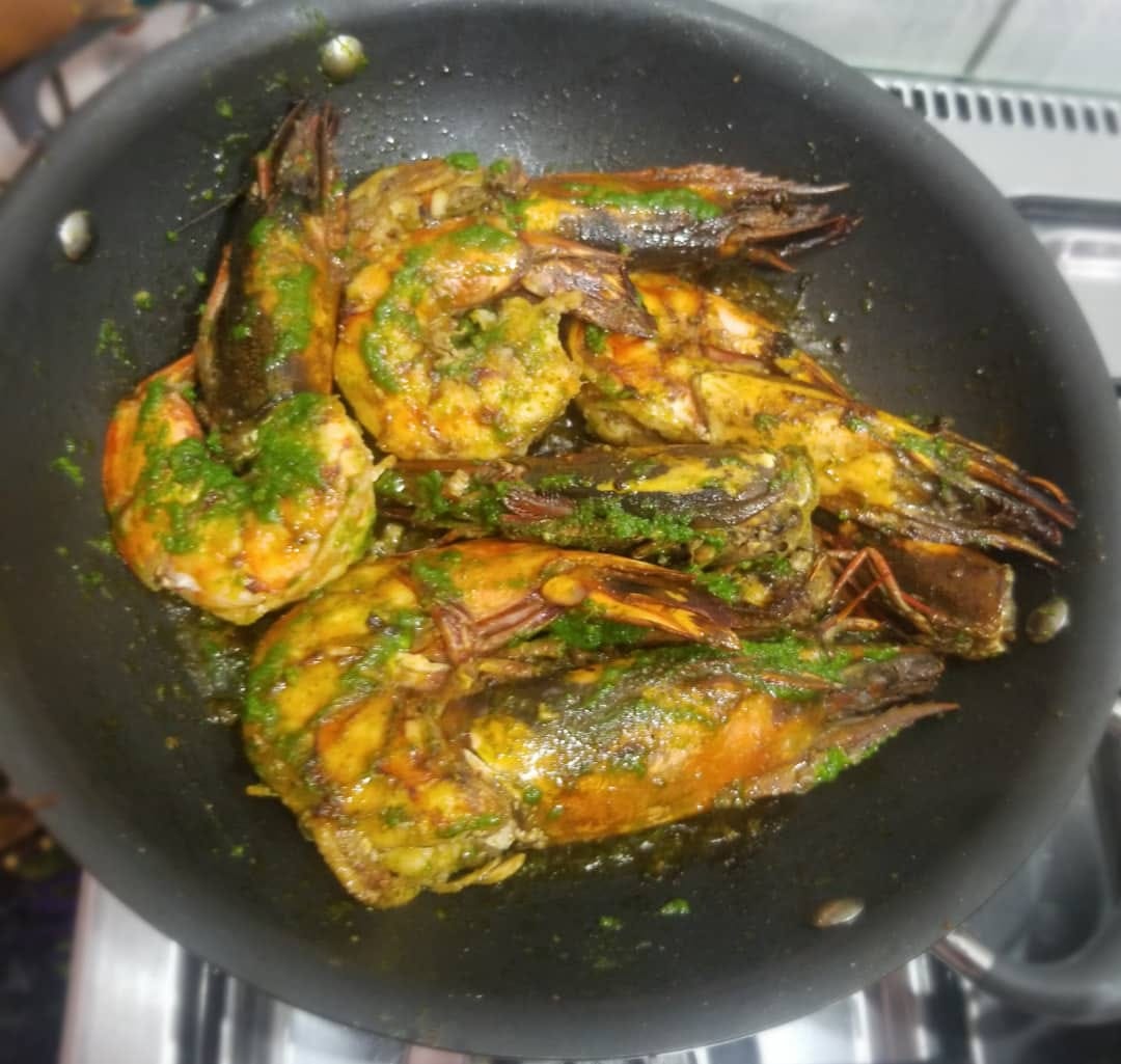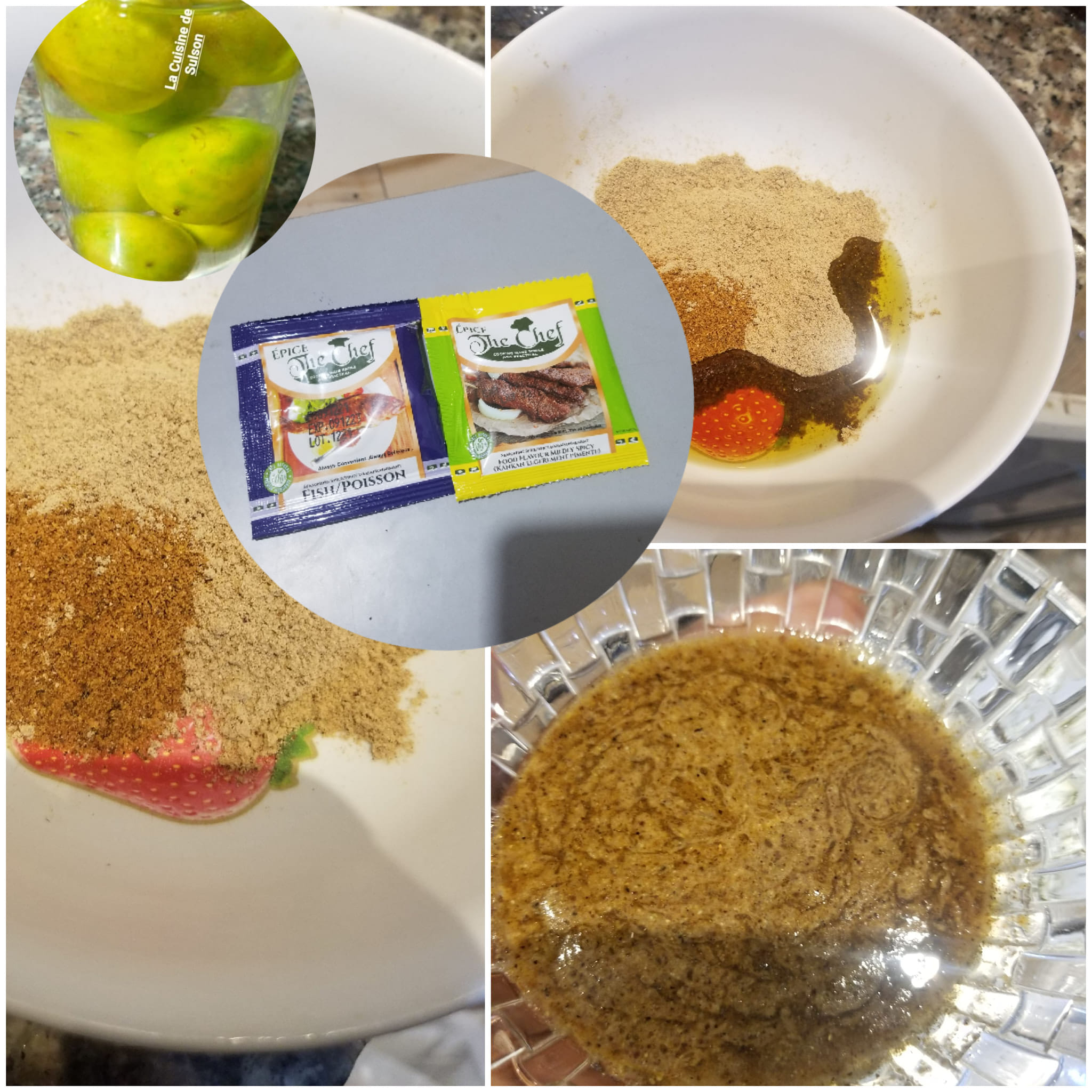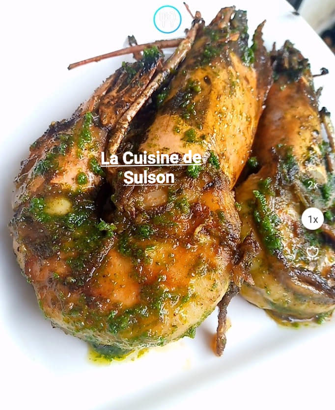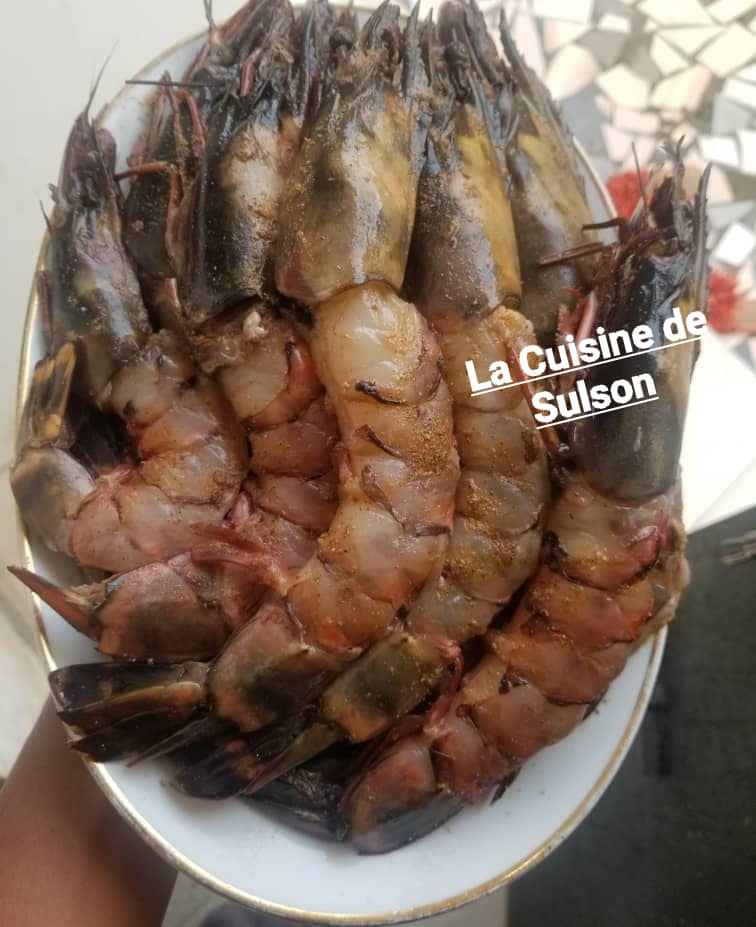 Apprêter la marinade. Pour un kilo de gambas, 1sachet epice the chef poisson et 1 sachet epice the Chef kankan. Sel jus d’un demi-citron et huile.