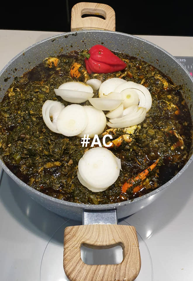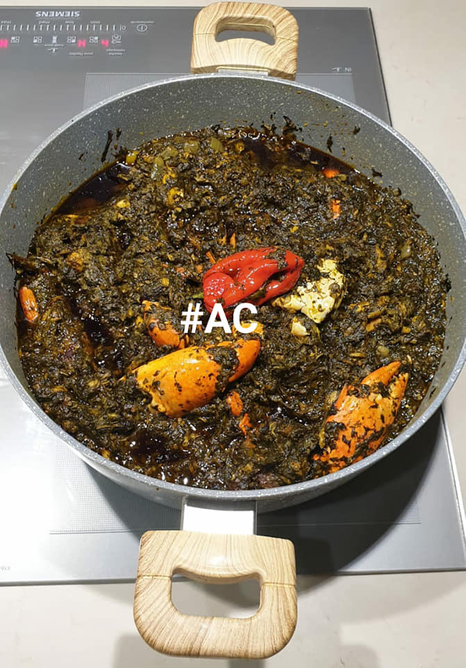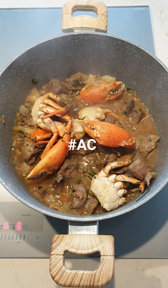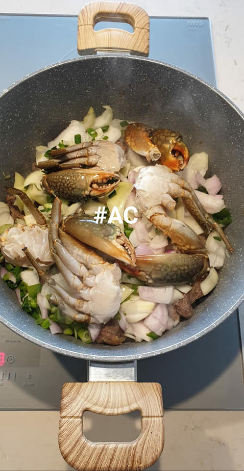 Rajouter du sel, une pincée de gingembre moulu, les oignons coupés , cube (facultatif) le piment écrasé, les crabes et 50cl d’eau encore puis laisser cuire tranquillement quelques minutes.