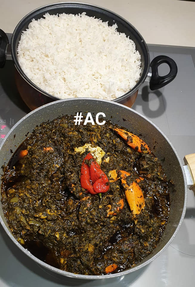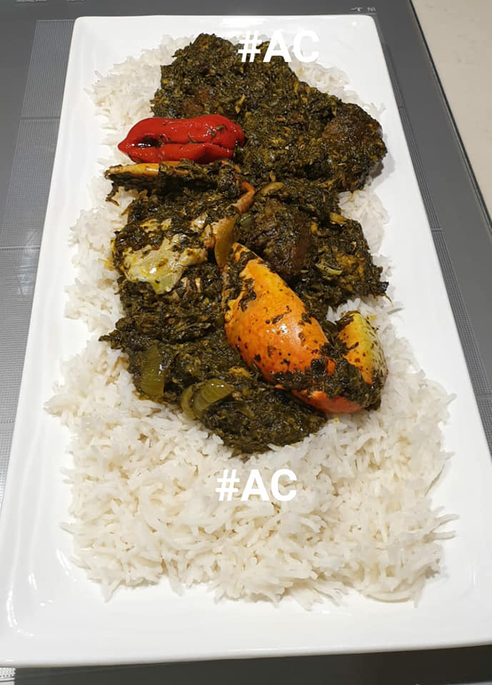 Servez la sauce feuilles avec du riz blanc, des morceaux de poulet grillé ou du poisson. Garnissez de quelques feuilles de coriandre pour une touche de fraîcheur.