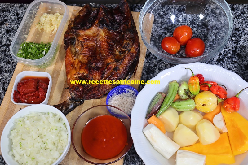 - Ajoutez les morceaux de poisson fumé, les morceaux de carottes, de pommes de terre et l’eau. Ajouter le piment et le sel selon votre goût.