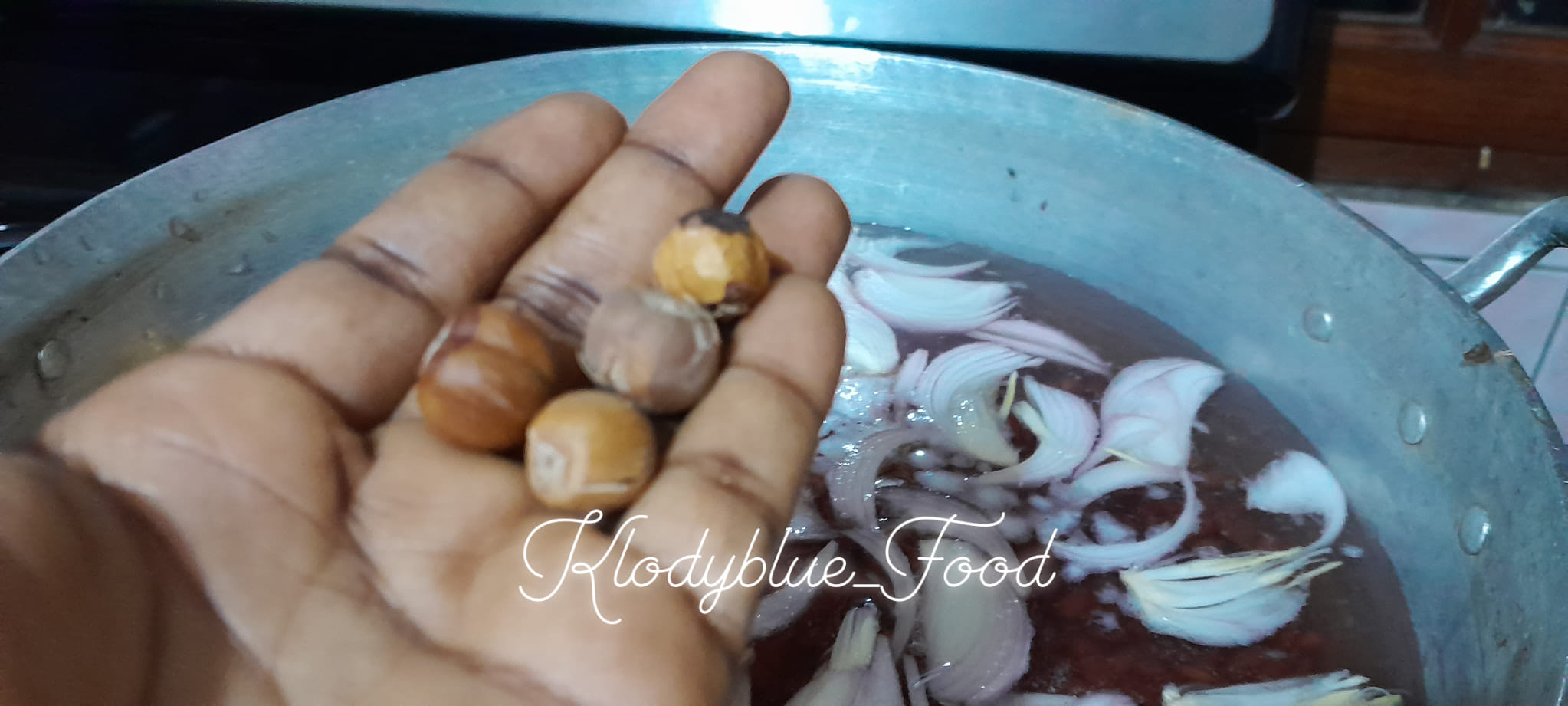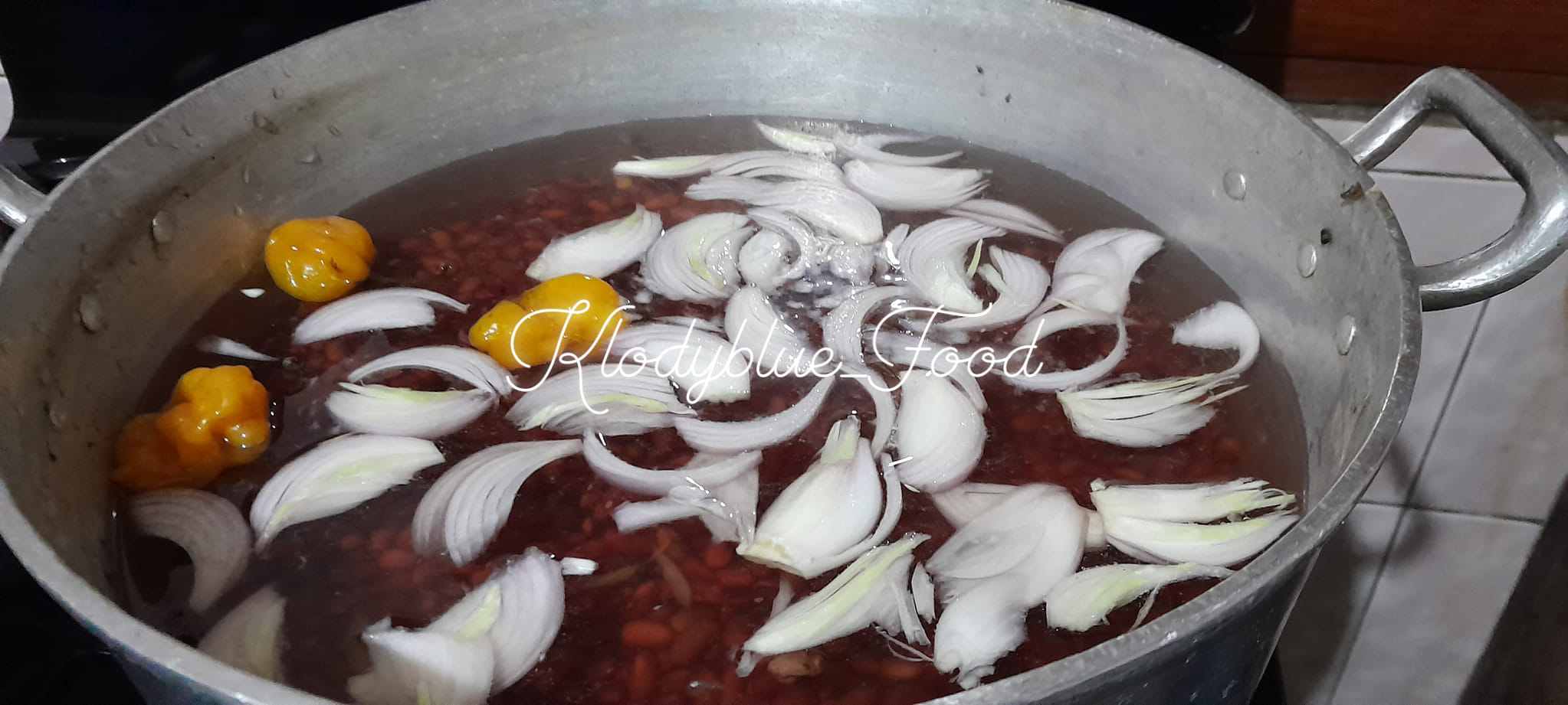 - Dans une marmite mettre le haricot, ajouter oignons, sel,piment, rondelles, poivre noir ,eau (à la hauteur des haricots) puis poser au feu et laisser cuire .