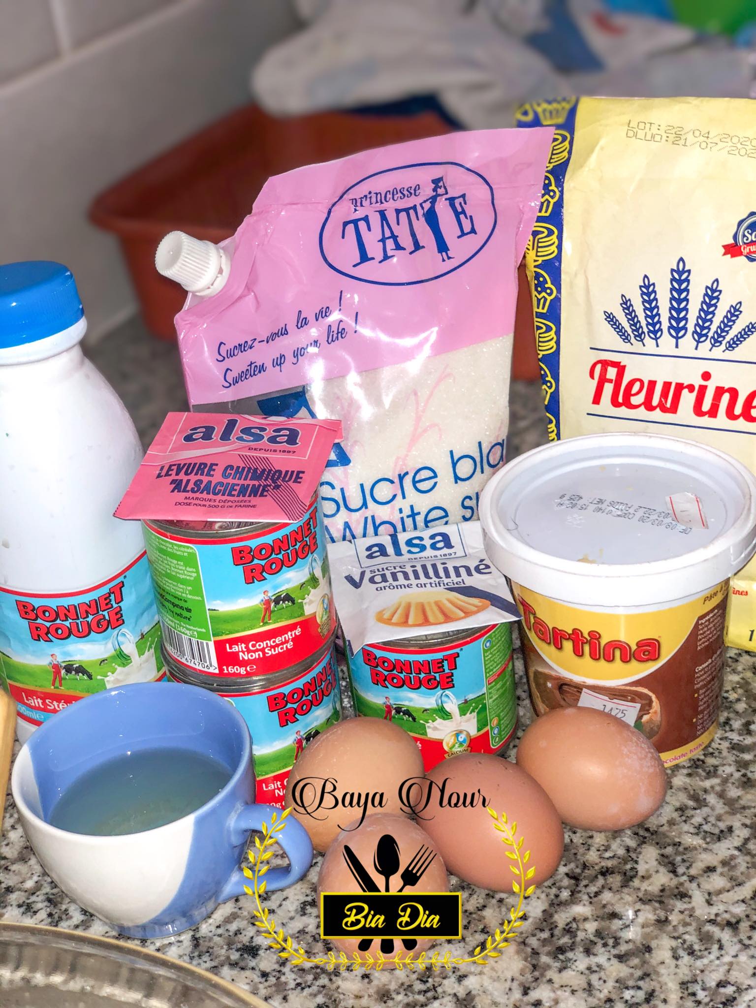 - Dans un saladier versez la farine ; levure chimique ; le sucre puis ajoutez progressivement le lait ( le mélange des 3 petites boites et la bouteille de lait demi-écrémé )