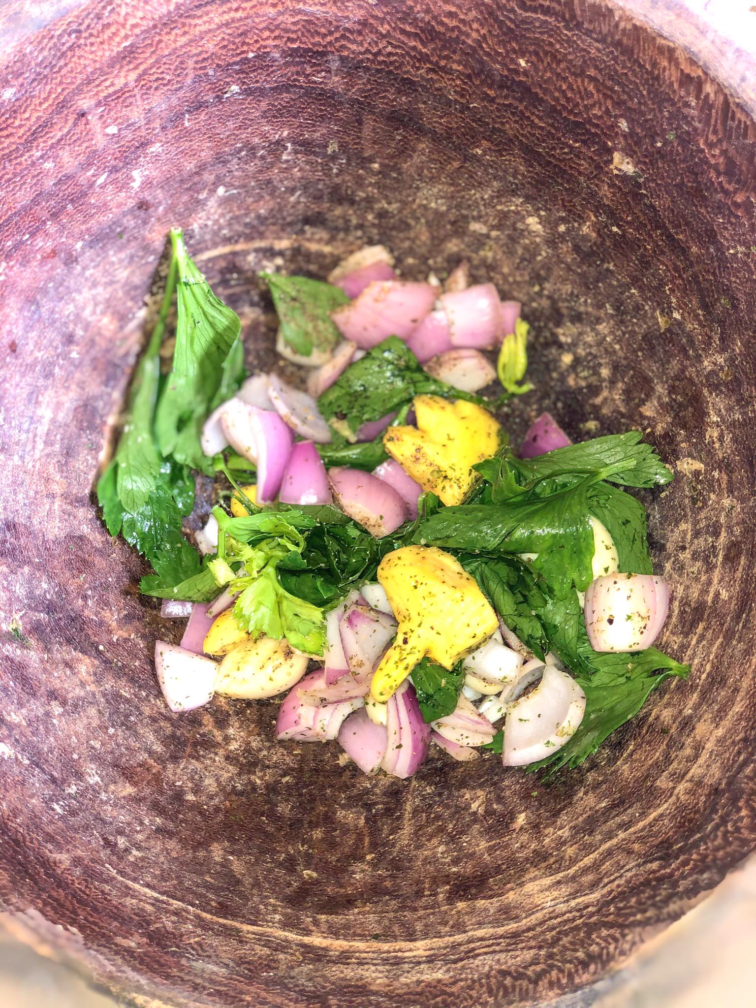- Écrasez par la suite les oignons, ails, gingembres, céleri vert, poivre noir, de la persillade ou juste quelques feuilles de persil à l’aide d’un mortier ou d’un robot mixeur.
