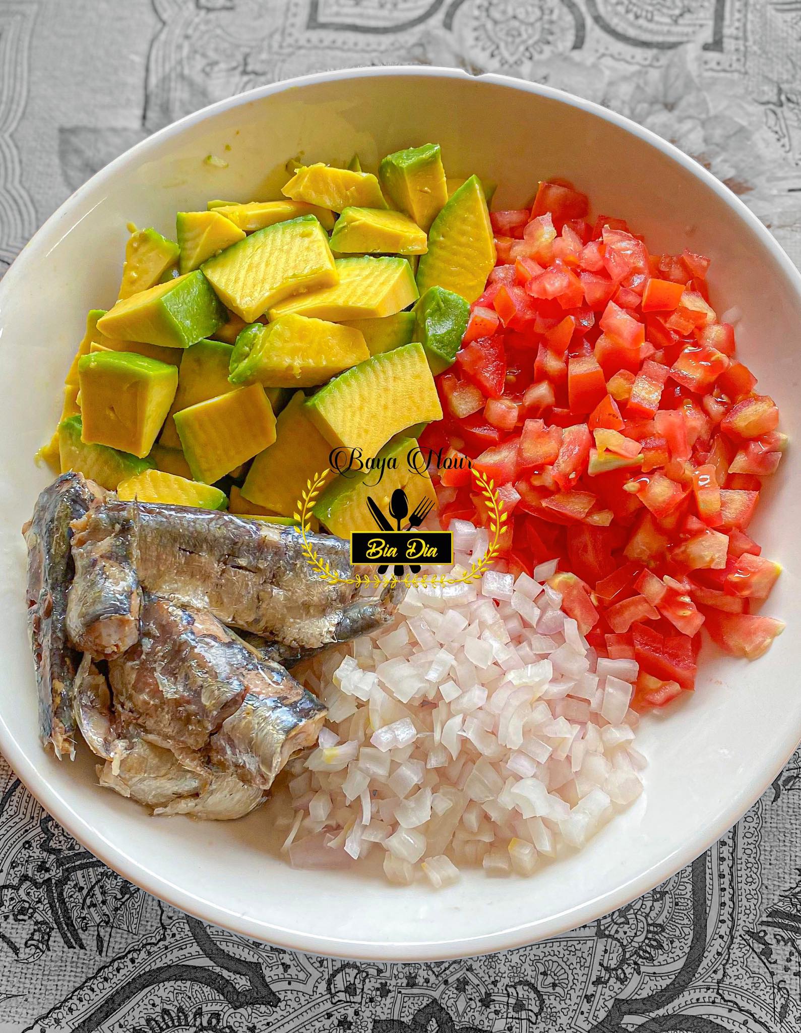- Dans un saladier ajoutez vos oignons , ail , tomates , avocats découpés .