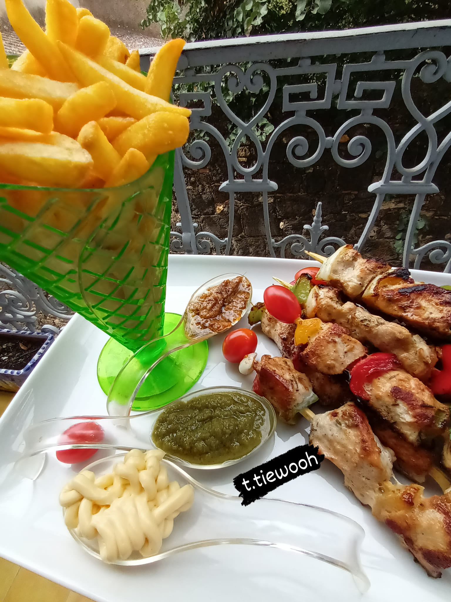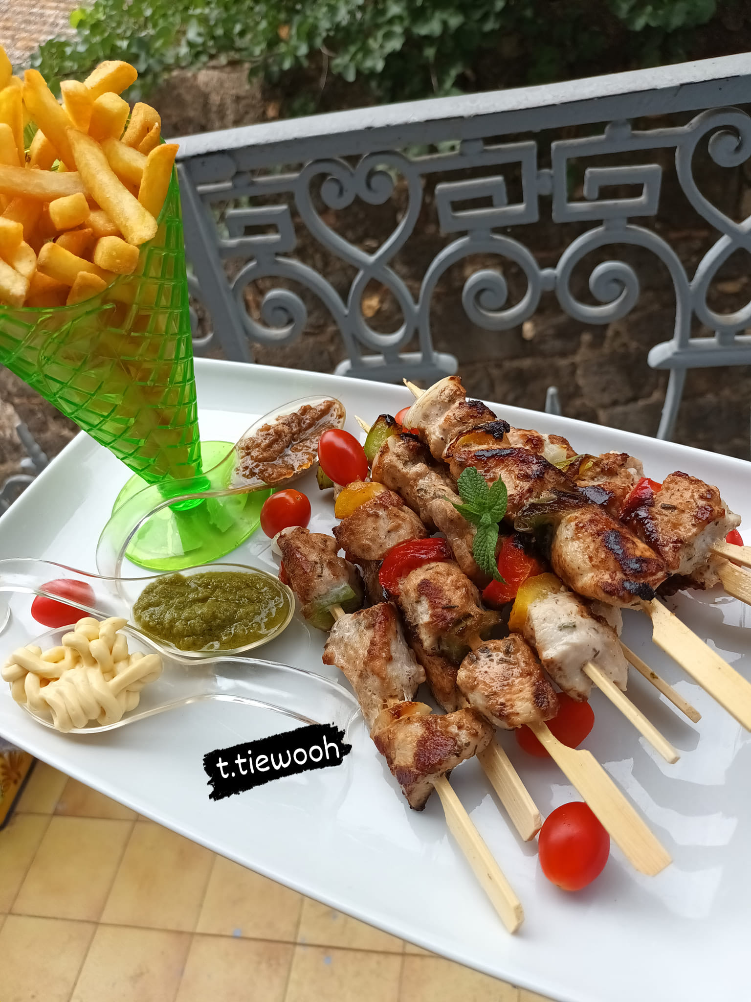 Savourez cette délicieuse brochette de poulet accompagnée de frites croustillantes, un plat qui ravira vos papilles. Parfait pour un repas en famille ou entre amis, ce plat simple et savoureux vous transportera directement au cœur des barbecues d'été.