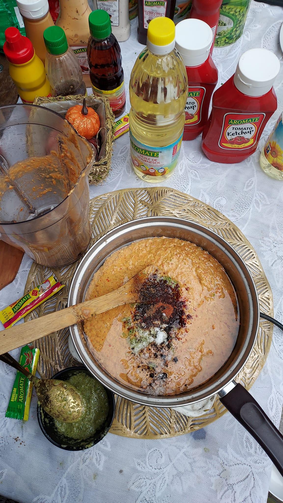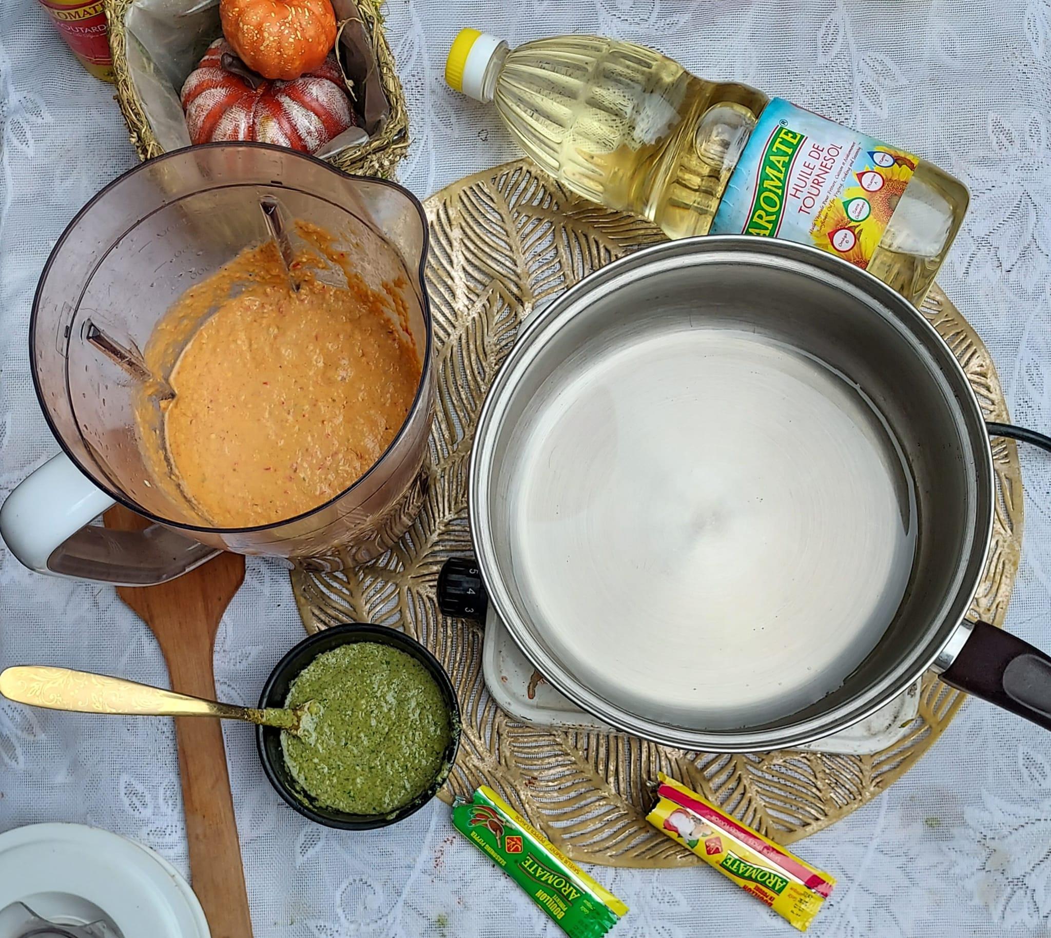 - Dans un mixeur, combinez les piments, l’ail, le persil, les tomates, l’oignon et le poivron.