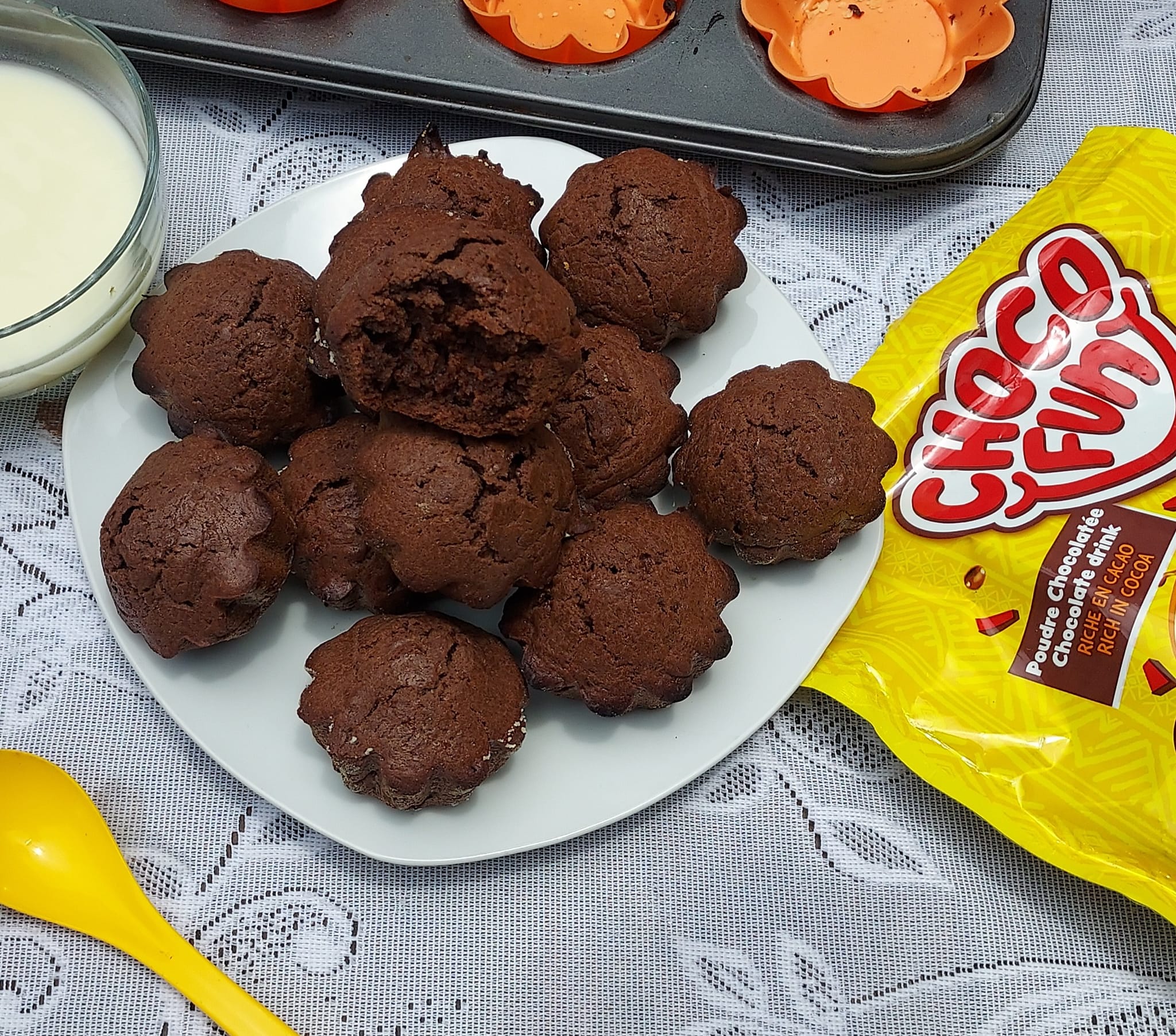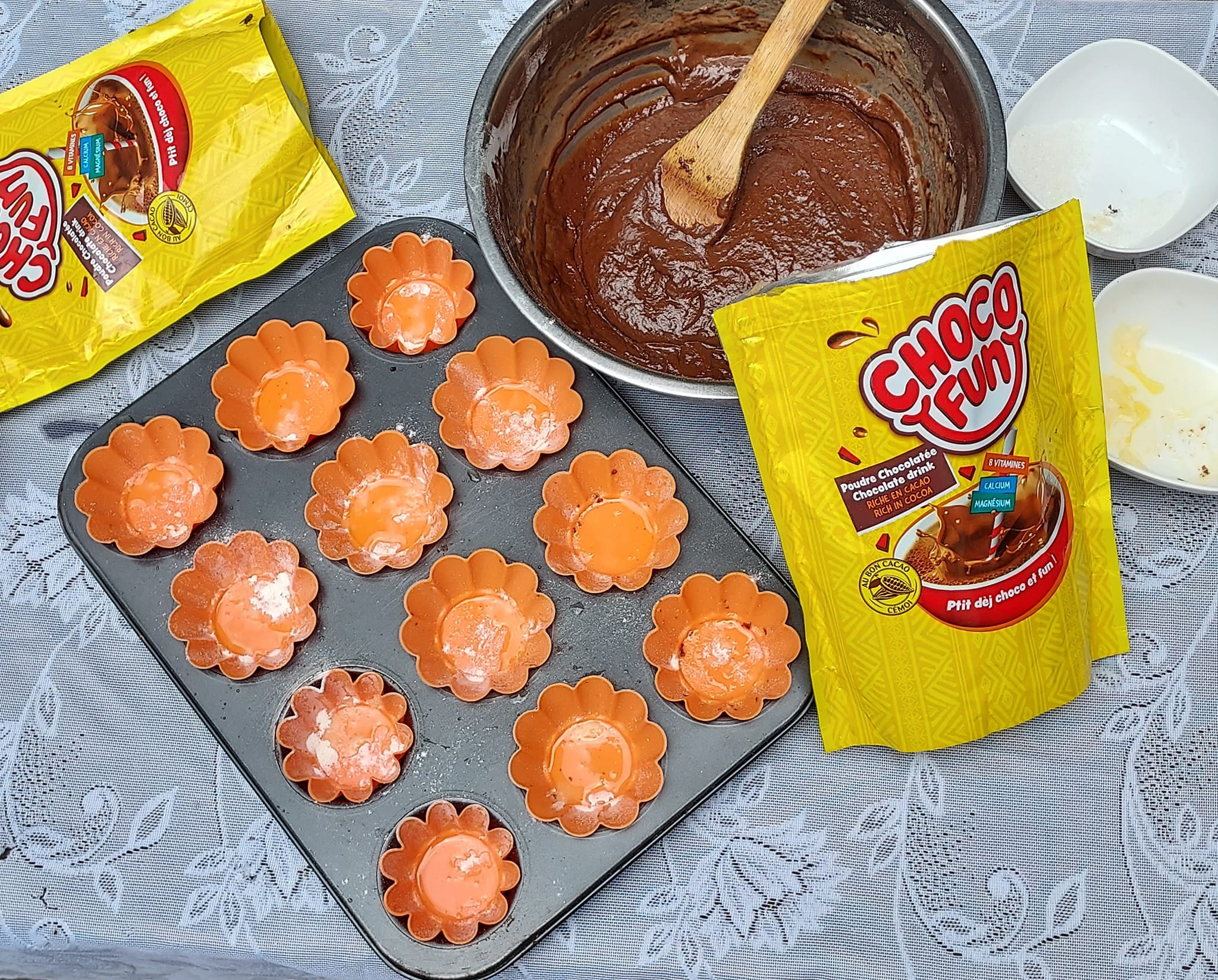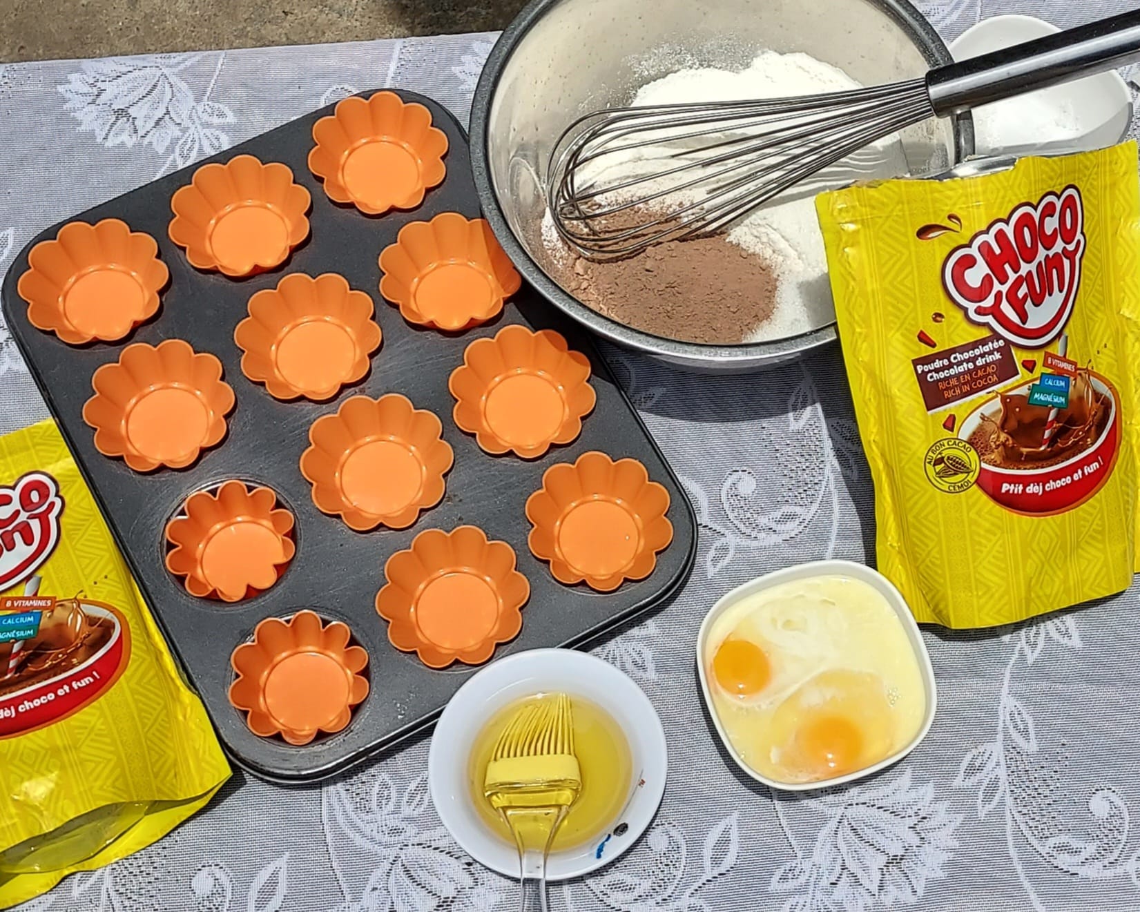 - Dans un grand bol, tamisez ensemble la farine, le chocofun et la levure chimique. Ajoutez le sucre et mélangez bien.