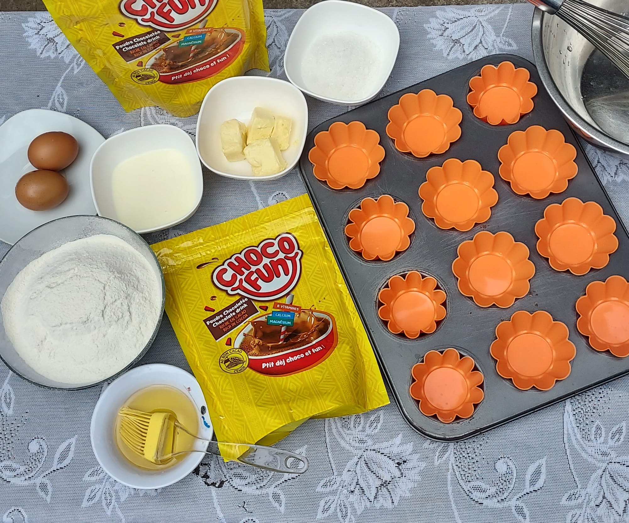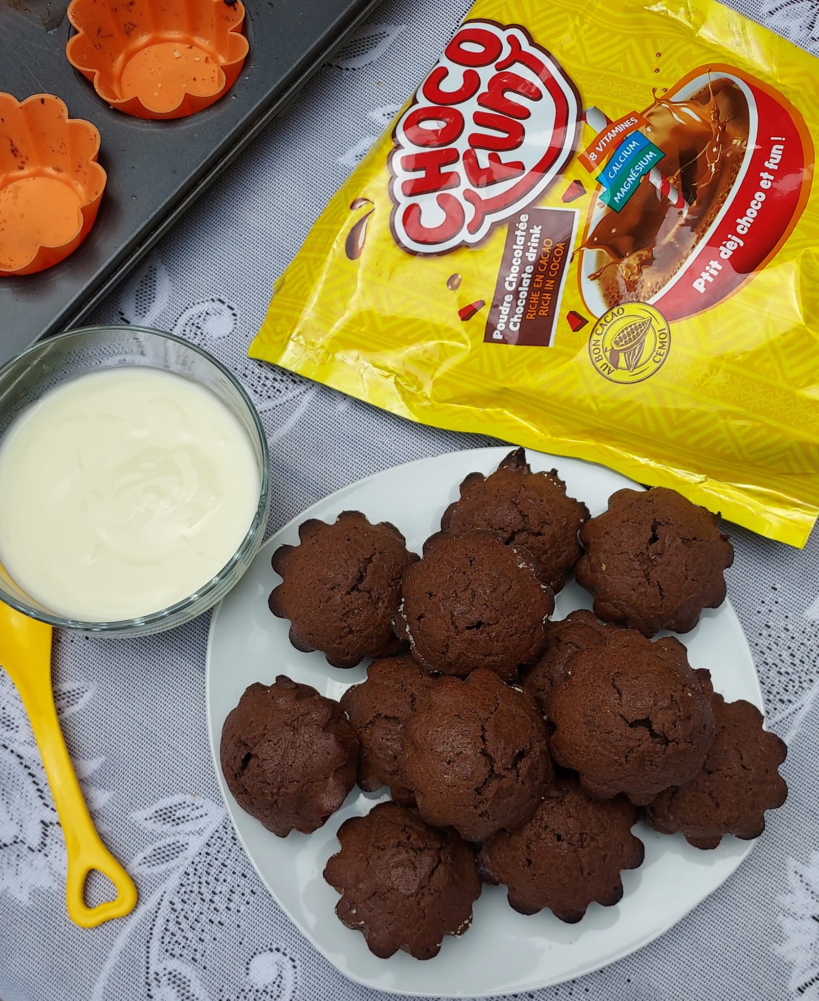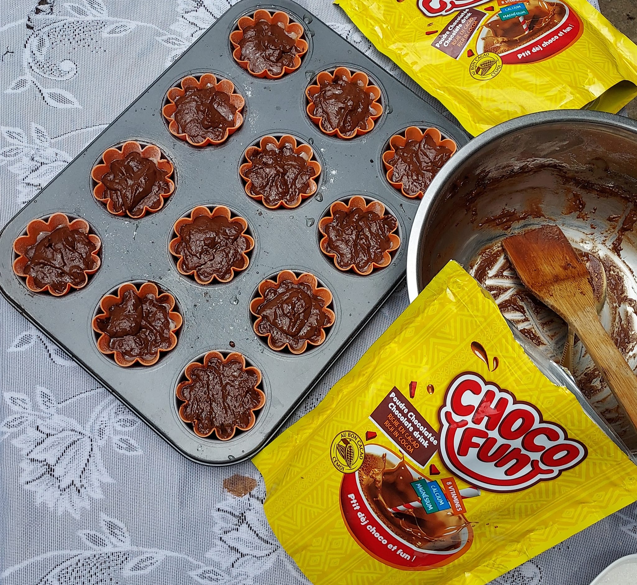 - Dans un grand bol, tamisez ensemble la farine, le chocofun et la levure chimique. Ajoutez le sucre et mélangez bien.