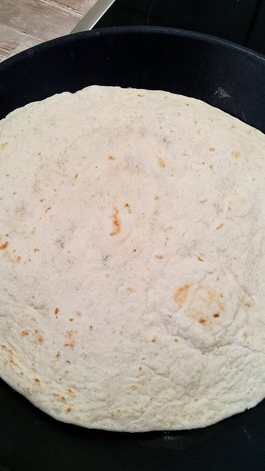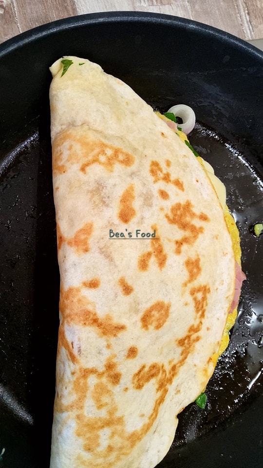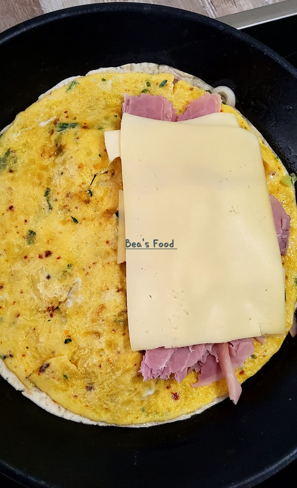 - Placez une tortilla sur l’omelette encore en cuisson, appuyez légèrement pour qu’elle adhère.